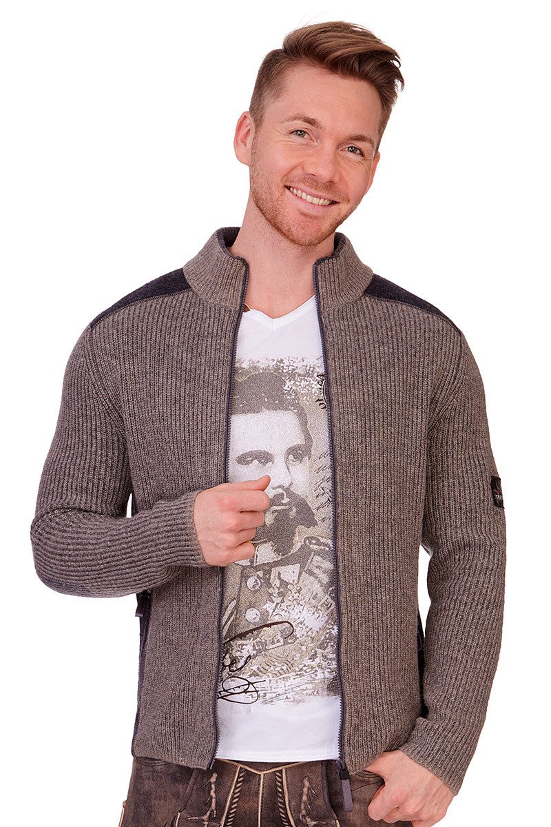 Diese stylische Herren Strickjacke namens Steinerberg aus dem Hause Spieth & Wensky hat einen weichen Woll-Anteil und ist durch ihren cool interpretierten Trachten-Look der perfekte Begleiter für Fashion-Hungrige. Sowohl die Vorder- und Rückseite als auch die Ärmel und der Stehkragen haben ein schickes Rippenstrick-Muster im feinen Zopf-Look; die Schultern und die Seiten sind aus kontrastfarbenem Walk-Stoff gefertigt. Der Kragen ist innen mit kontrastfarbenem Rippenstrick-Material verstärkt, das außen als Kontrastkante sichtbar ist. Vorn gibt es einen Reißverschluss mit einem Ripsband-Anhänger am Zipper und auch die beiden Eingrifftaschen verfügen über einen Reißverschluss mit Stoffanhänger; zudem sind die Reißverschlüsse allesamt beidseitig kontrastfarben abgepaspelt. Die Ärmel haben rechteckige Ellenbogen-Partien in Kontrastfarbe und der linke Ärmel oben einen Aufnäher mit Jahreszahl, Markenname und Geweih-Motiv. Den Nackenbereich ziert ein raffiniertes Rippenstrick-Muster in V-Form sowie eine kleine Stoffschlaufe unter dem Kragen. Die hervorragende Herren Strickjacke mit Walk-Partien passt prima zu Lederhose und Trachtenjeans.