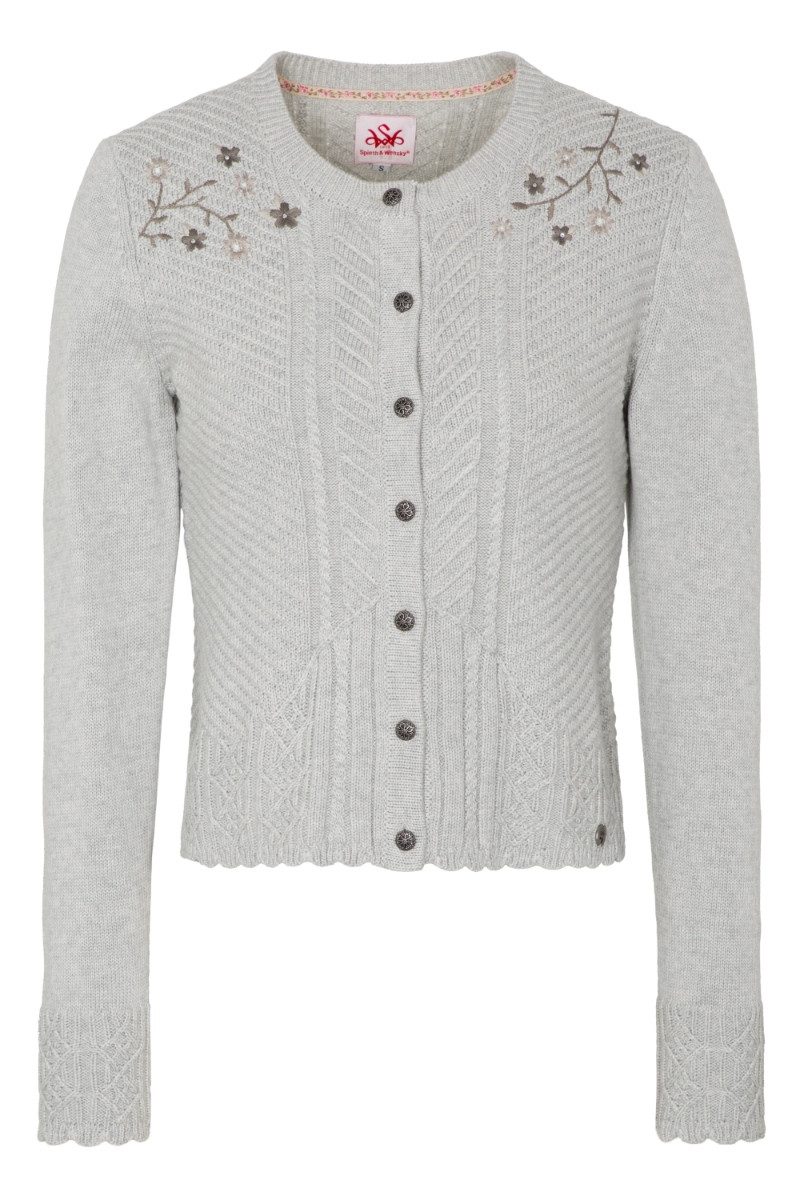 Die hinreißende, kurze Trachten Strickjacke Weda - eine märchenhafte Kreation für Damen von der Marke Spieth & Wensky - wird tailliert mit schöner, weicher Baumwolle gefertigt und hat eine grandiose Strickmuster-Komposition. Der Rundhals-Ausschnitt ist im Rippenstrick-Look, die Vorder- sowie Rückseite sind in Rechtsstrick mit eingestrickter, diagonaler Rippenstruktur gestaltet, beiseitig neben der Knopfleiste sowie hinten befinden sich fantastische, herrlich kombinierte Strick-Arrangements aus Links-, Zopf- und Rechtsstrick mit Querrippen-Struktur, die Ärmel haben ein klassisches Rechtsstrick-Muster und den Jackenabschluss sowie die Bündchen sind fabelhaft in Aranstrickmuster-Art gearbeitet. Sowohl der Bund und die Ärmelbündchen schließen wellenförmig ab. Perfekt wird die liebliche Damen Strickjacke durch die leicht glänzenden, farblich passenden Blumenranken-Stickereien, deren Blütenstempel der fünfblättrigen Blüten mit funkelndem Strass besetzt sind, und die altsilbernen Ösenknöpfe im Ornamentik-Design mit Blüten. Über dem Saum vorn links befindet sich zudem ein rundes Marken-Emblem aus Metall in Altsilber mit Logo und Herz-Motiv. Die entzückende Strickjacke lässt sich hübsch zu Dirndl, Trachtenrock, -Jeans und Lederhose kombinieren.