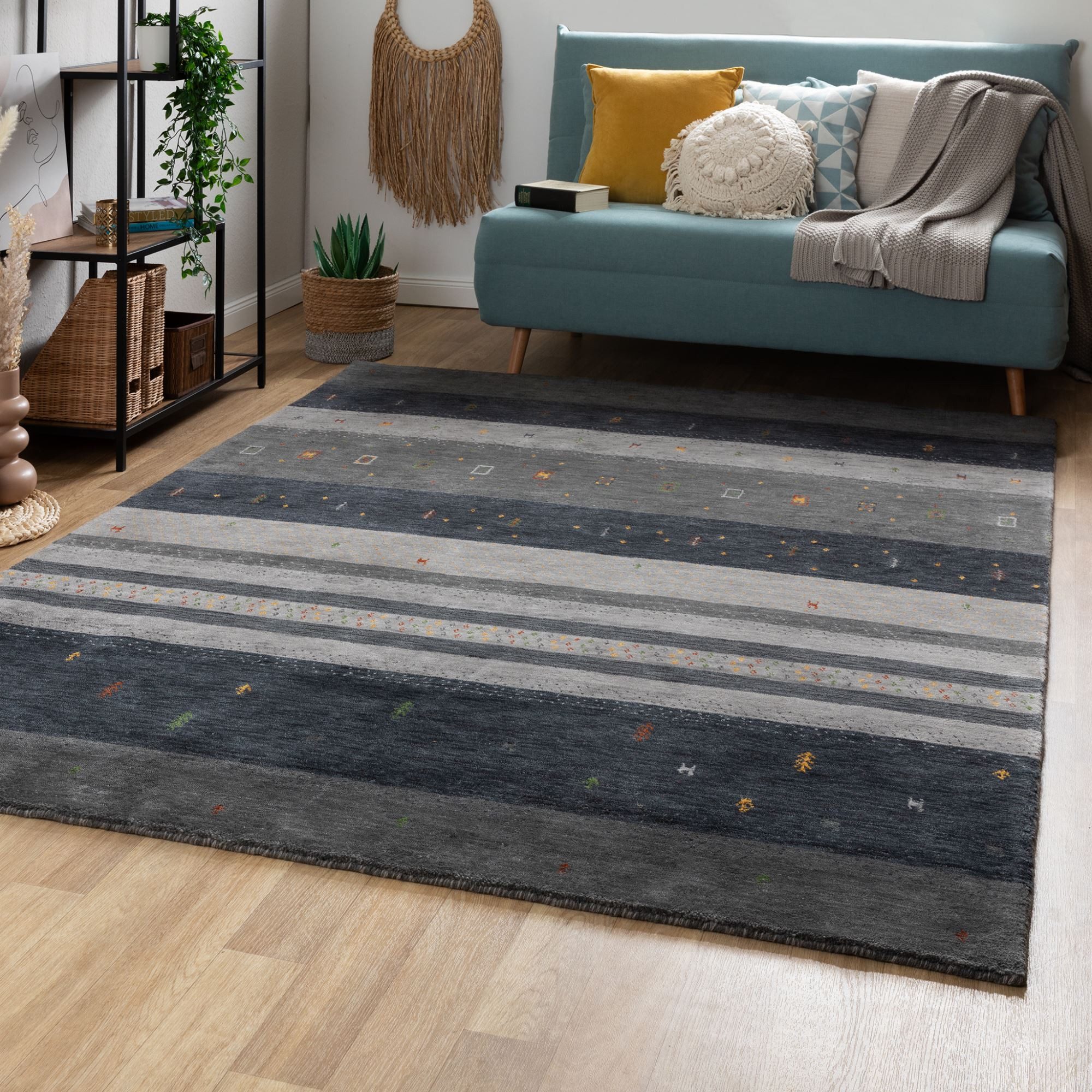 Mit seinen Farben, seinem lebendigen Streifenmuster und den kleinen, verspielten Motiven im traditionellen Gabbeh-Stil ist der Teppich Shiraz ein echter Gewinn für deine Einrichtung. Mit knapp 4 kg Wolleinsatz pro Quadratmeter macht sich der Shiraz nicht nur optisch positiv bemerkbar, sondern sorgt auch für Wärme und Behaglichkeit im Raum.