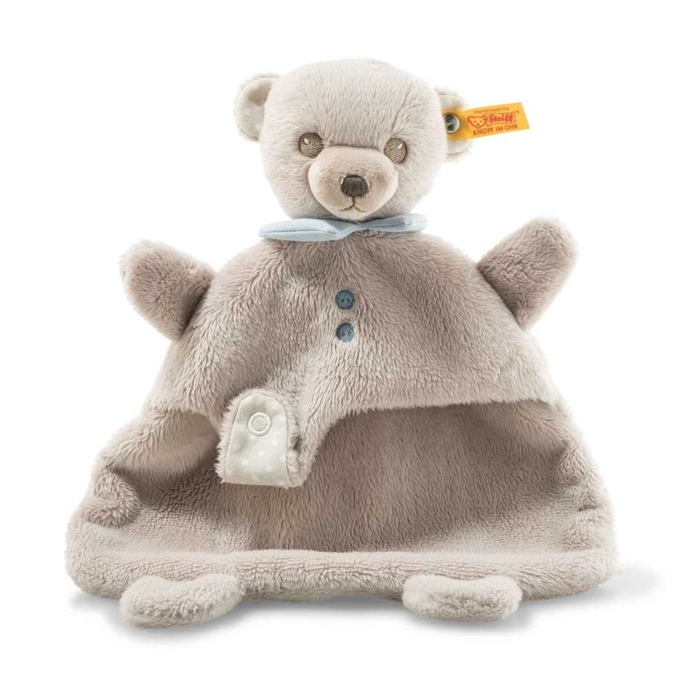 Steiff 241451 Hello Baby Levi Teddybär Schmusetuch in Geschenkbox 28cm, Material: aus Plüsch für babysanfte Haut, mit synthetischem Füllmaterial gestopft, Farbe: grau/blau, mit gestickten Augen, mit Rassel, mit Edelstahl "Knopf im Ohr," waschmaschinenfest bei 30° C. Das Hello Baby Levi Teddybär Schmusetuch ist 28 cm groß und aus speziellem, besonders weichen Plüsch für die zarten Babyhände gefertigt worden. Es ist grau und wird von einem Bärenköpfchen gekrönt. Dessen Gesicht wirkt durch gestickte, niedliche braune Äuglein und eine gestickte Nasen-Mundpartie in gleicher Farbe besonders freundlich. In Brusthöhe sind gestickte Knöpfe in Blau angebracht. Sie harmonieren mit dem hübschen, blauen Kragen. Die Innenohren sind ebenso wie der Unterstoff der Brust und die Schnullerbefestigung in hellerem grau gehalten und mit weißen Pünktchen verziert. Besonders lustig wird es, wenn man vom Unterstoff aus einen Finger in den Kopf des Bärchens steckt und so eine Handpuppe erhält. Passend dazu die schöne Geschenkbox in edlem Design. Die heraustrennbare Grußkarte kann beschriftet werden. Wird sie entfernt, entsteht ein kleines zusätzliches Sichtfenster.