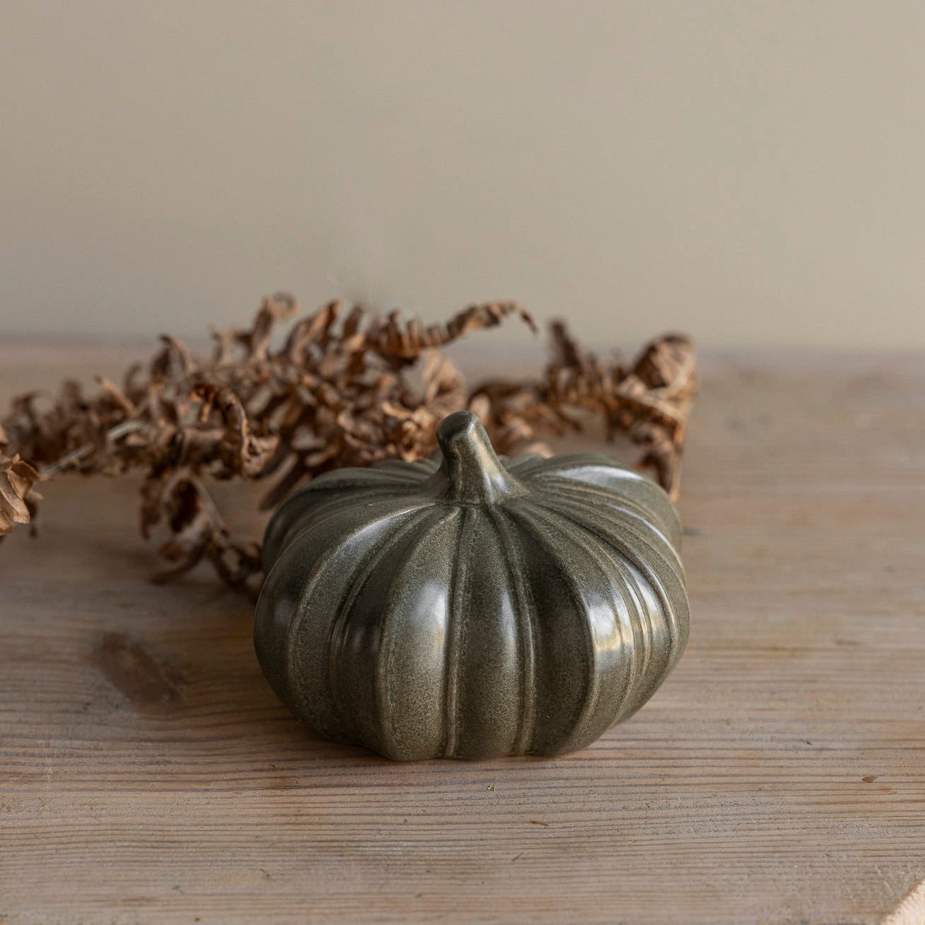 Eine Herbstdekoration, die Dir lange Freude bereitet: unser Keramikkürbis von der Skandi Marke Storefactory in einem schönen Grün-Ton.