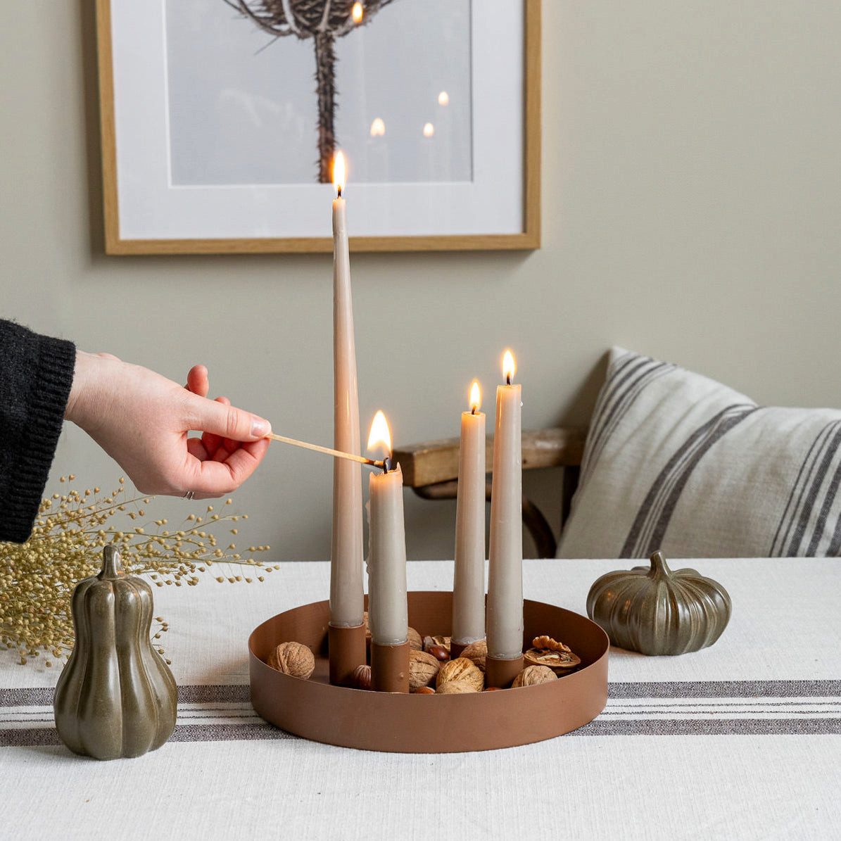 In der Weihnachtszeit wirkt das Tablett mit vier Kerzen besonders schön mit den Weihnachtsbäumen und -figuren von Storefactory.