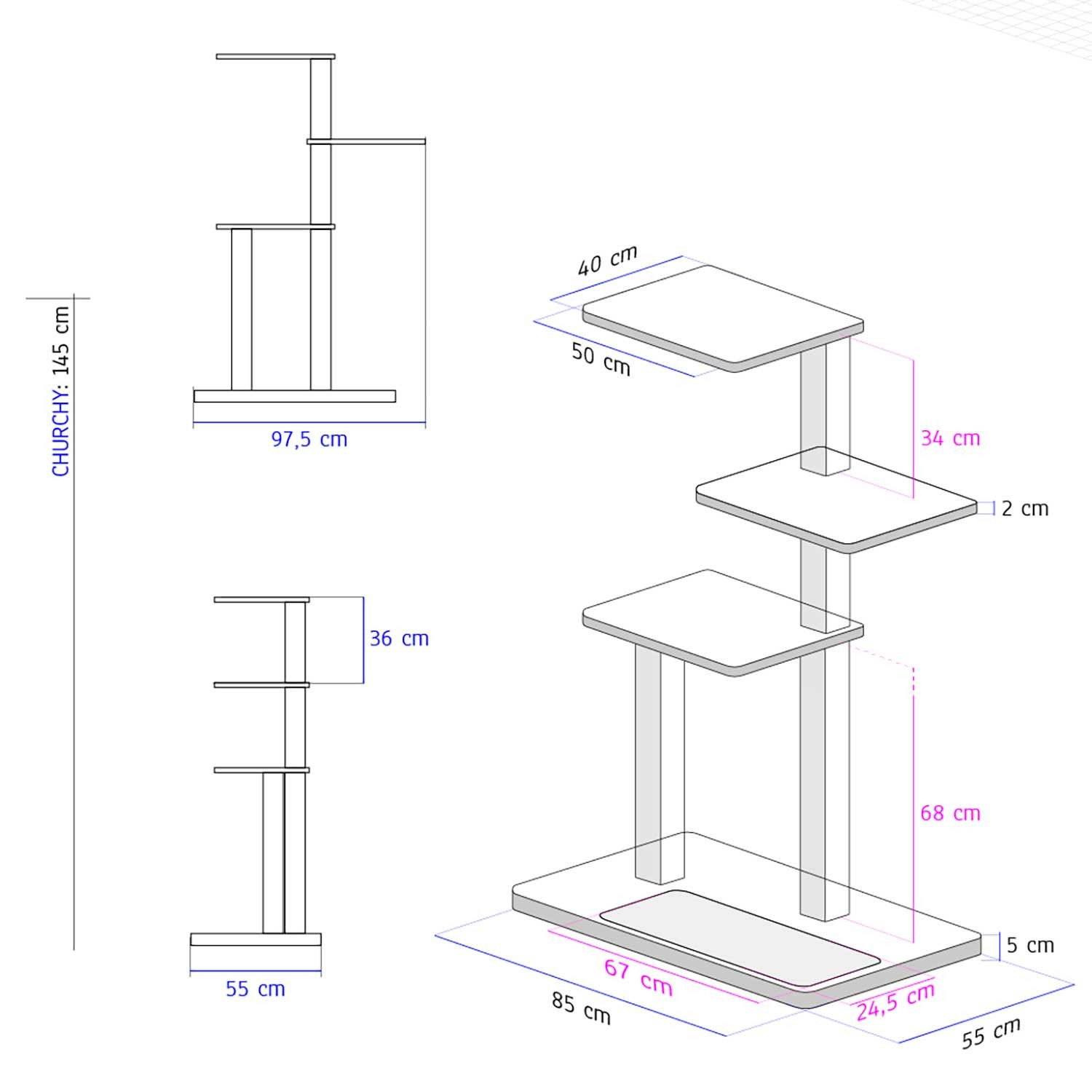 CHURCHY - ein echter Hingucker nicht nur für Stubentiger! Der Kratzbaum CHURCHY bietet den idealen Rückzugsort für deine Katze. Verschiedene Ebenen laden zum Klettern ein, die Plattformen zum Entspannen und Ausruhen und Kratzmöglichkeiten zum Entschärfen der Krallen. Eine extra große Bodenplatte (85 x 55 cm) sorgt für Bodenhaftung, zwei im unteren Bereich angebrachte Stämme geben Standfestigkeit. Der Stamm wird mittels hochwertiger Beschläge sicher und stabil auf der Bodenplatte fixiert. Das Werkzeug dafür wird gleich mitgeliefert. Die eckigen Stämme (8 x 8 cm) aus getrocknetem Fichtenholz sind komplett mit robustem und hochwertigem 100% Sisal ausgerüstet. Die dichte Struktur sorgt für lange Lebensdauer und die Kratzfreude für die Katze ist garantiert. Im Vergleich zu herkömmlichen Sisalschnüren wirkt die feine Weboptik des Sisal filigran und edel und ist dabei äußerst strapazierfähig und langlebig. Die große Bodenplatte aus beschichteter MDF-Platte ist mit einer eingelassenen Kratzfläche ausgestattet, damit bietet CHURCHY viele Möglichkeiten zur Krallenpflege. Die oberen zwei Liegeflächen, ebenfalls aus beschichteter MDF-Platte, sind um 360° drehbar und können individuell ausgerichtet werden. Zu dem Kratzbaum liefern wir unsere Cozy Kissen, die einerseits auf dem Kratzbaum kaum auffallen, andererseits den Liegekomfort eines dicken Kissens bieten. Eine Besonderheit des Kissens ist die hohe Strapazierfähigkeit, denn der von uns eingesetzte Pet-Friendly Bezugsstoff stammt aus dem Möbel-Hochwertbereich. Er ist für eine starke Beanspruchung ausgelegt.