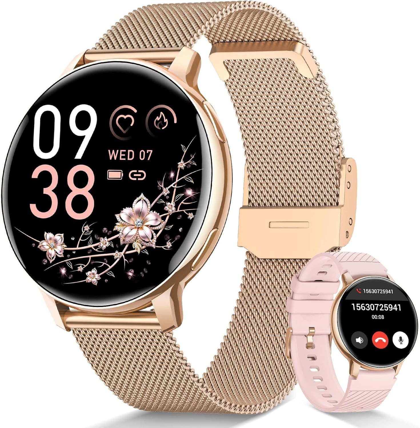 Diese Damen Smartwatch kombiniert Stil und Funktionalität. Das 1,39-Zoll-HD-Display mit 360×360 Pixeln bietet eine gestochen scharfe Darstellung und Augenschutz-Technologie. Über 400 vorinstallierte Zifferblätter oder eigene Fotos geben dir kreative Freiheit. Das leichte 29g-Gehäuse und die zwei mitgelieferten Armbänder – ein Edelstahl- und ein Silikonarmband – passen zu jedem Anlass.