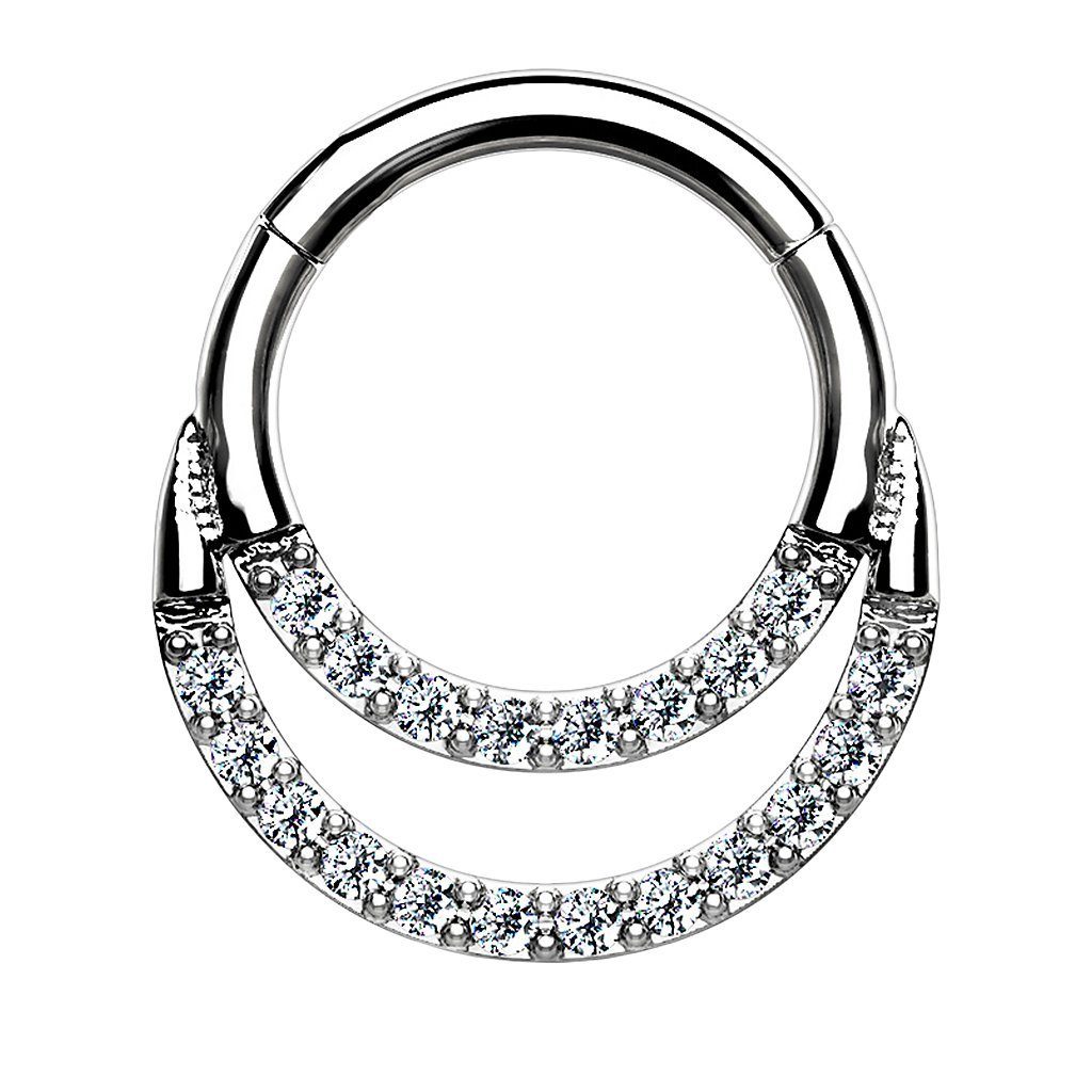 Dieser elegante Segmentring aus Titan G23 kombiniert modernes Design mit hoher Hautverträglichkeit. Die doppelte Kristallreihe sorgt für ein auffälliges Funkeln und verleiht dem Ring einen stilvollen Look. Titan G23 ist leicht, robust und ideal für empfindliche Haut. Dank des praktischen Click Mechanismus lässt sich der Ring bequem öffnen und sicher schließen. Er eignet sich für Septum, Nase, Tragus oder Helix und ist in den Größen 6 mm, 8 mm und 10 mm erhältlich.