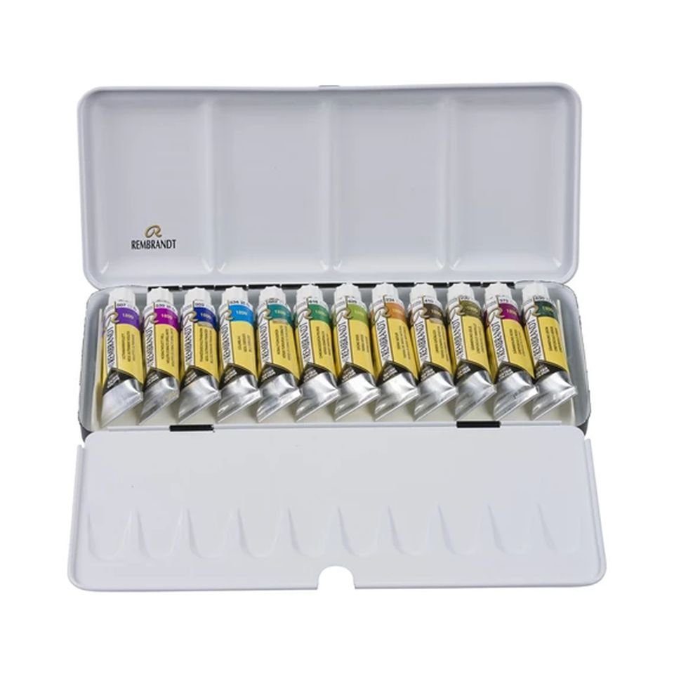 Seit 1899 hat sich die Rembrandt Aquarellfarbe zu einem unverzichtbaren Sortiment für den professionellen Aquarellkünstler entwickelt. Diese lebendigen Aquarellfarben werden aus reinem Gummiarabikum und hochwertigen Pigmenten hergestellt, die ein Höchstmaß an Lichtechtheit bieten. Das Sortiment an Rembrandt Aquarellfarben umfasst auch verschiedene Optionen für Künstler, die gerne mit schimmernden Metallic-und Perlglanz-Farben sowie irisierenden Farbtönen arbeiten. Tragen Sie diese Farben in einer dünnen Schicht auf ein dunkles Aquarellpapier oder über eine bereits gemalte Aquarellschicht auf, um ein optimales Ergebnis zu erzielen. Das Opaque White Mixing Set enthält die Farben: 12 x 10-ml-Tuben (248 Azogelb dunkel – 297 Benzimidazolorange – 364 Chinacridonrot – 368 Chinacridonrosa Magenta – 583 Phthalorotblau – 585 Indanthrenblau – 593 Chinacridonpurpur Blau – 675 Phthalogrün – 681 Phthalogrüngelb – 715 Neutralfarbe – 2 x 106 Deckweiß).