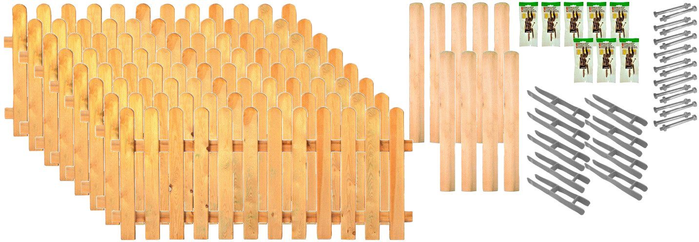 | Lieferumfang | 8 Elemente 180x80 cm; 9 Pfosten 9x9x110 cm Kopf Bischofsmütze; 9 H-Pfostenträger, 8 Pakete L-Beschläge mit Schrauben; 9 Pakete Durchgangsschrauben. |
