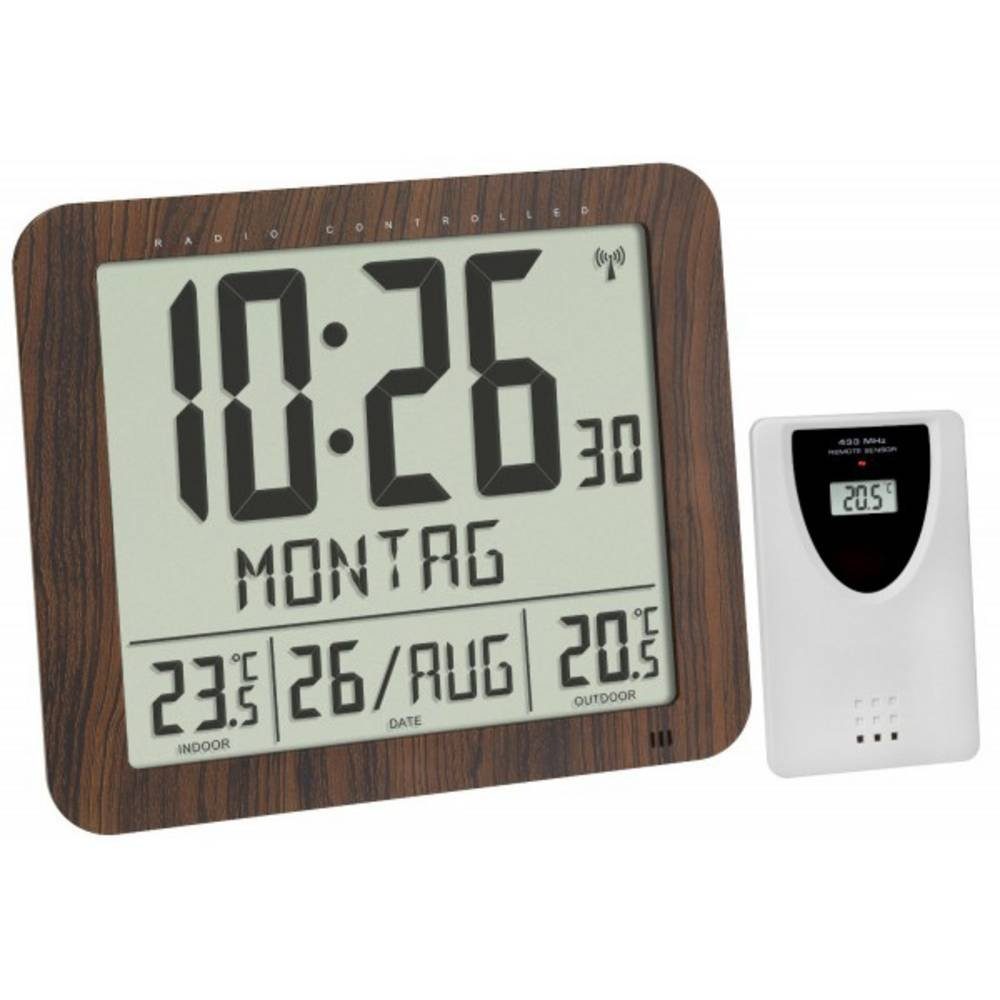 Denn die Uhrzeit wird über das DCF77 Signal auf die Sekunde genau eingestellt und auch der Wechsel von Winter- auf Sommerzeit erfolgt automatisch. Die digitale Anzeige ist groß und gut ablesbar, ideal nicht nur für zuhause, sondern auch für das Büro, das Wartezimmer, den Eingangs- oder Empfangsbereich. Auf dem übersichtlichen Display wird neben dem Datum mit ausgeschriebenem Wochentag noch die Innen- und Außentemperatur angezeigt. Zur Ermittlung der Außentemperatur postieren Sie den mitgelieferten Sender im Freien. Die Werte werden dann per Funk mit einer Reichweite von bis zu 70 m auf die Funkuhr übertragen. Tolle Zusatzfunktion: Ein Temperaturalarm kann so eingestellt werden, dass beispielsweise bei Frost oder bei extrem hohen Temperaturen ein Alarmsignal ertönt. Auch als Wecker kann dieses praktische Gerät genutzt werden. Das schlichte und klare Design in Holzoptik passt in jede Umgebung, gleichgültig, ob Sie die Funkuhr aufhängen oder hinstellen möchten..