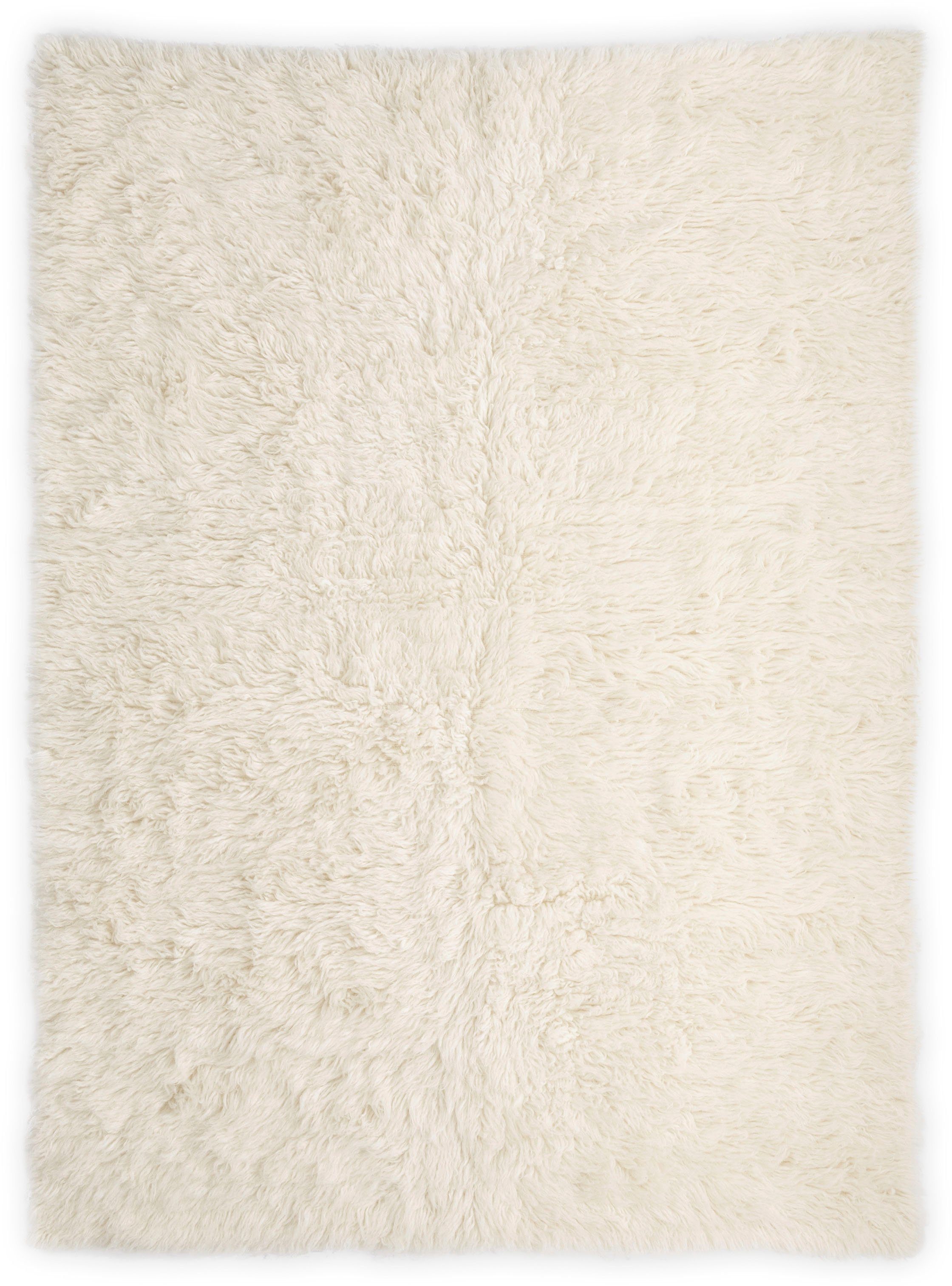 Ist ein typischer Flokati, eher kein Teppich. Wie eine feste gewebte Wolldecke. Die Zotteln sind zwar ca 4 cm lang, da aber nur jede 3. Webreihe welche hat, liegen die flach auf. Farbe ist naturhell-eierschalfarben, die ist ok.