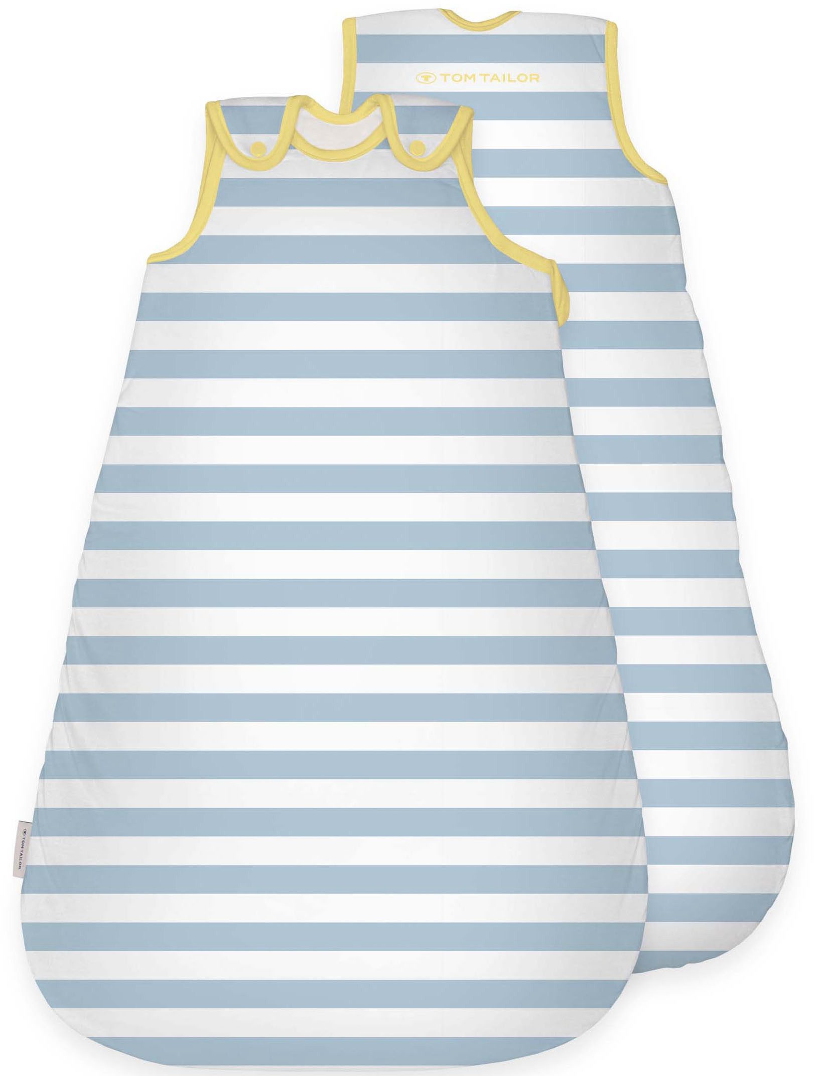 Geborgenheit und Komfort für süße Träume: Entdecke den TOM TAILOR Babyschlafsack - Light Lemon & Sky Blue - die ideale Wahl für einen sicheren und erholsamen Schlaf. Diese Schlafsäcke, aus 100% weicher Baumwolle gefertigt, sind in einem dezenten einfarbigen Design oder einem modernen gestreiften Look erhältlich. Das zeitlose und zugleich moderne Design fügt sich harmonisch in jedes Kinderzimmer ein. Hochwertige Materialien: Mit einer TOG-Bewertung von 2,5 bieten die TOM TAILOR Sleeping Bags genau die richtige Wärme für dein Baby, besonders in der Übergangszeit. Die atmungsaktive Baumwolle sorgt dafür, dass dein Kind angenehm schläft, ohne zu überhitzen, während das weiche Material sanft zur empfindlichen Haut ist. Durchdachtes Design: Die Nähte an den Armen und im Hals-/Nackenbereich sind extra weich verstärkt und farblich abgesetzt, um noch mehr Schutz und Komfort zu bieten. Diese Details sorgen für eine sanfte Passform und verhindern ein Scheuern an empfindlichen Stellen, sodass dein Baby bequem schlafen kann. Funktional und praktisch: Der TOM TAILOR Babyschlafsack - Light Lemon & Sky Blue bietet deinem Baby die Freiheit, sich im Schlaf zu bewegen, und sorgt gleichzeitig für eine gemütliche Umhüllung, die ein angenehmes Schlafklima schafft. Er lässt sich zudem perfekt mit anderen Heimtextilien aus der TOM TAILOR Kollektion kombinieren, um ein harmonisches Gesamtbild zu schaffen. Wohlfühlen von Anfang an: Sorge für eine ruhige und komfortable Schlafumgebung mit den TOM TAILOR Sleeping Bags, die modernes Design und Funktionalität nahtlos verbinden. COLOR CHANGES EVERYTHING!