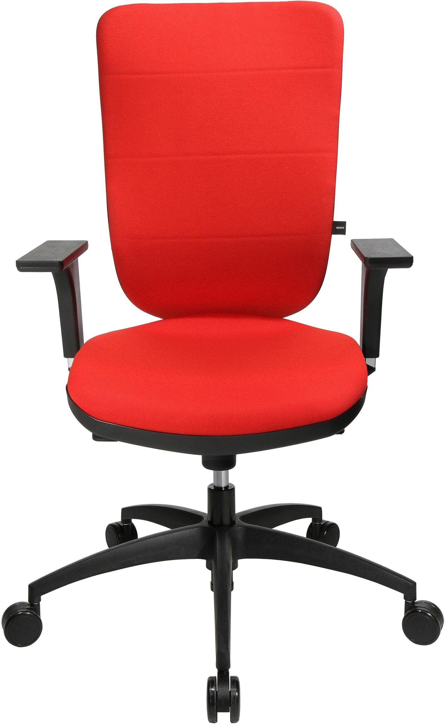 Design-Drehstuhl in trendiger Optik. Stufenlose Sitzhöhenverstellung mit Toplift. Rückenlehne mit kaschiertem, gesteppten Stoff bespannt, Lehnenrückseite mit elastischen Gummibändern, in der Höhe per Druckknopf verstellbar. Spezialbandscheibensitz mit Knierolle - dadurch wird das Becken aufgerichtet und die Wirbelsäule verläuft in einer natürlichen S-Form - für gesundes Sitzen! Neue Punktsynchronmechanik, zur synchronen Verstellung der Sitz- und Rückenlehnenneigung - mit einstellbarer Körpergewichtsregulierung, Rückenlehne folgt den Bewegungen des Sitzenden und unterstützt den Rücken optimal. Design-Polyamid-Fußkreuz schwarz, ausgerüstet mit lastabhängig gebremsten Sicherheitsdoppelrollen für Teppichböden. Inklusive höhenverstellbare Armlehne »S2(NP1)«. Strapazierfähiger und robuster Stoffbezug aus 100 % Trevira CS. Dieses Modell trägt das GS-Zeichen der Intertek in Fürth und erfüllt in diesem Zusammenhang sämtliche sicherheitsrelevanten Voraussetzungen.