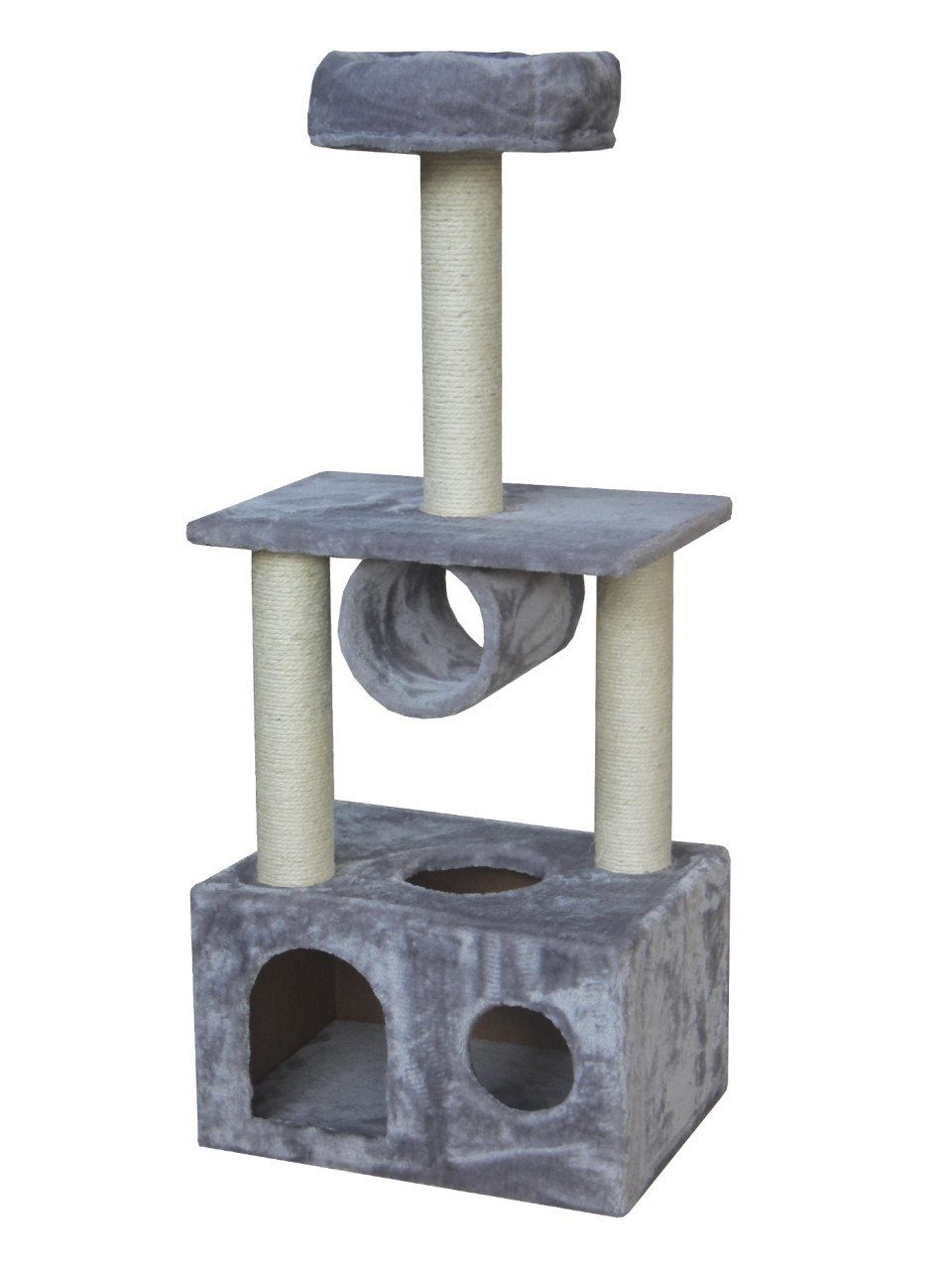 Produktdetails: Für Katzen | 50 x 35 cm | Höhe: 116 cm | Sisalumwickelte Stämme Ø 9 cm | 2 Liegeflächen + Höhle | Plüsch, Sisal, MDF-Holz |