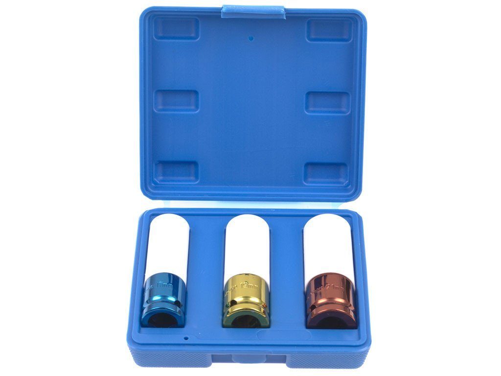 Produktdetails: Material: Chrom-Molybdän-Stahl mit Kunststoffummantelung | Länge: 8,6 mm | Aufnahme: 17, 19, 21 mm | Größe: 1/2" Vierkantantrieb (12,7 mm) | mit farblicher Unterscheidung der Schlüsselweiten | zur sicheren Montage und Demontage von Alufelgen, ohne diese zu beschädigen | 3-teilig, mit Kunststoffhülse für Alufelgen |