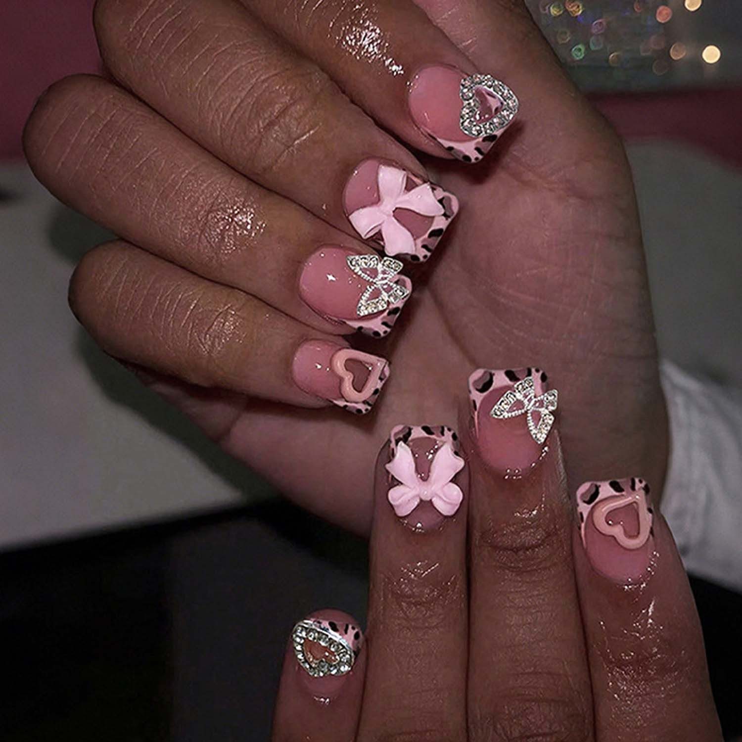 Kunstfingernägel 24 abnehmbare künstliche Fingernägel mit Schleifen- Herz-Strasssteinen