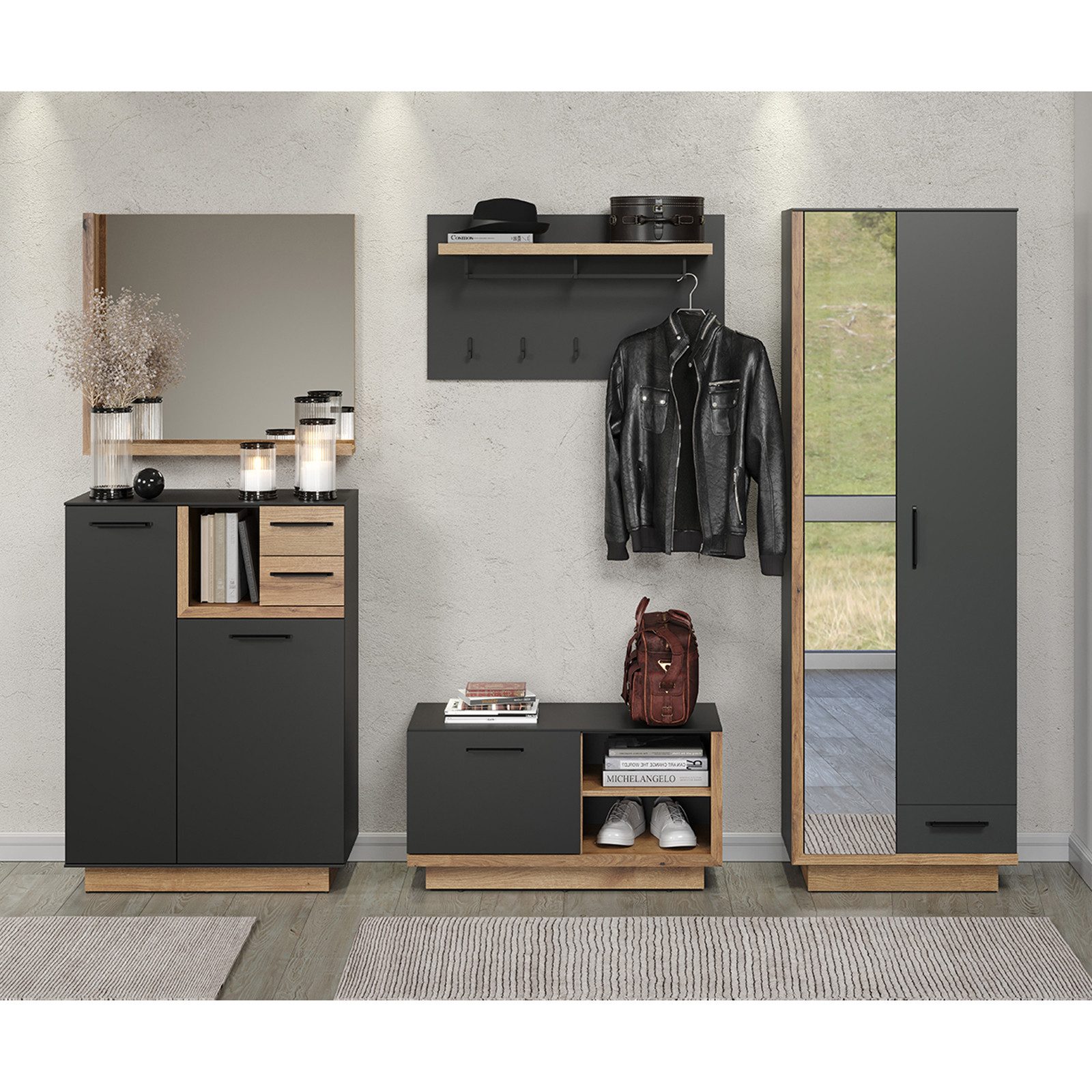 Dieses 5-teilige Garderobenmöbelset in Anthrazit und Coast Evoke Eiche Nachbildung ist ein wahrer Blickfang im Eingangsbereich. Das moderne Design mit schwarzen Griffen bietet nicht nur eine tolle Optik, sondern auch praktischen Stauraum. Die enthaltenen Elemente wie Garderobenspiegel, Kommode, Garderobenpaneel, Garderoben Sitzbank und Garderobenschrank bieten genügend Platz für Kleidung, Schuhe und Accessoires. Mit diesem Set wird jeder Eingangsbereich stilvoll und funktional gestaltet.
