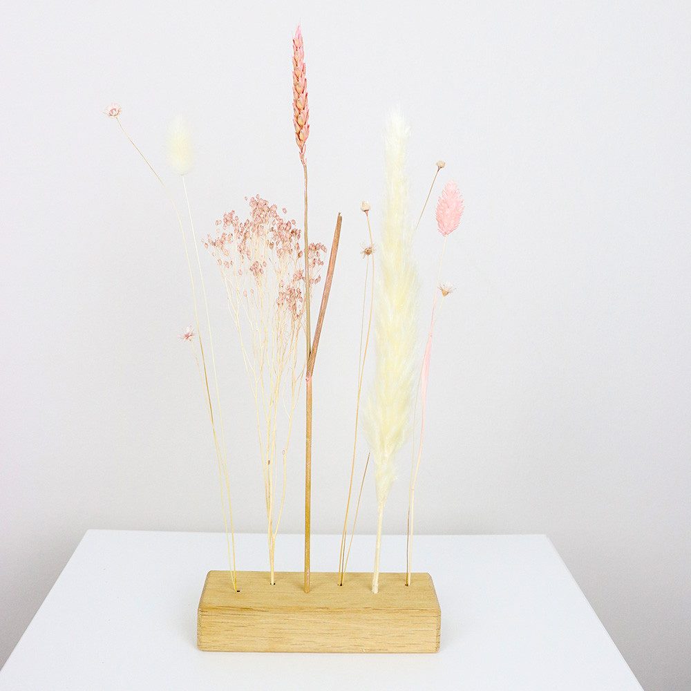 Eine sanfte Farbkombination, die einen Hauch von Entspanntheit vermittelt. Egal ob du deine FlowerBar auf ein Regal stellst oder an die Wand hängen möchtest, sie wird zu einem echten Hingucker in deinem Zuhause. Edles Eichenholz für unsere Flowerbar und die Kombination aus rosa Phalaris, Weizen und Schleierkraut. Die weißen Elemente wie Lagurus und das weiße Pampasgras runden den perfekten Look für dein Zuhause ab. TROCKENBLUMEN – EIN NATURPRODUKT Alle von uns getrockneten oder konservierten Blumen werden in liebevoller Handarbeit für dich arrangiert. Da es zu leichten Abweichungen in Farbe und Form kommen kann ist jedes Arrangement ein echtes Unikat. Da es sich bei unseren Blumen um echte, getrocknete Blumen und somit um ein saisonabhängiges Produkt handelt, kann es vorkommen, dass einige Blüten und Elemente deiner Flowerbar durch ein anderes Element der gleichen Farbe ersetzt werden. Das Erscheinungsbild und die Farbpalette deiner Bar bleiben jedoch immer gleich. PFLEGELEICHT Unsere Blumen benötigen kein Wasser und keine besondere Pflege. Ein Platz, der nicht direkt in der Sonne ist, freut sie umso mehr. So können sie ihre Farbintensität noch länger beibehalten. Unser Holz ist ca. 2,8 cm hoch und 5 cm tief – bei der Länge kannst du 13 cm, 30 cm, 60 cm und 120 cm auswählen. Auf dem Foto ist unsere Flowerbar der Länge 120 cm abgebildet. Egal ob du deine FlowerBar auf ein Regal stellst oder an die Wand hängen möchtest, sie wird zu einem echter Hingucker in deinem Zuhause.