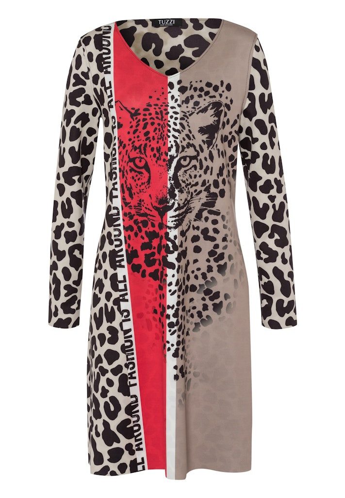 Dieses Kleid von TUZZI begeistert mit einem echten Wow-Faktor: Dank Wendefunktion bietet es zwei Looks in einem – mal im Allover-Leomuster, mal mit Colorblocking und Leopardenmotiv. Offene Schnittkanten und glatte Scuba-Qualität verleihen dem Kleid einen lässigen, edlen Feinschliff.