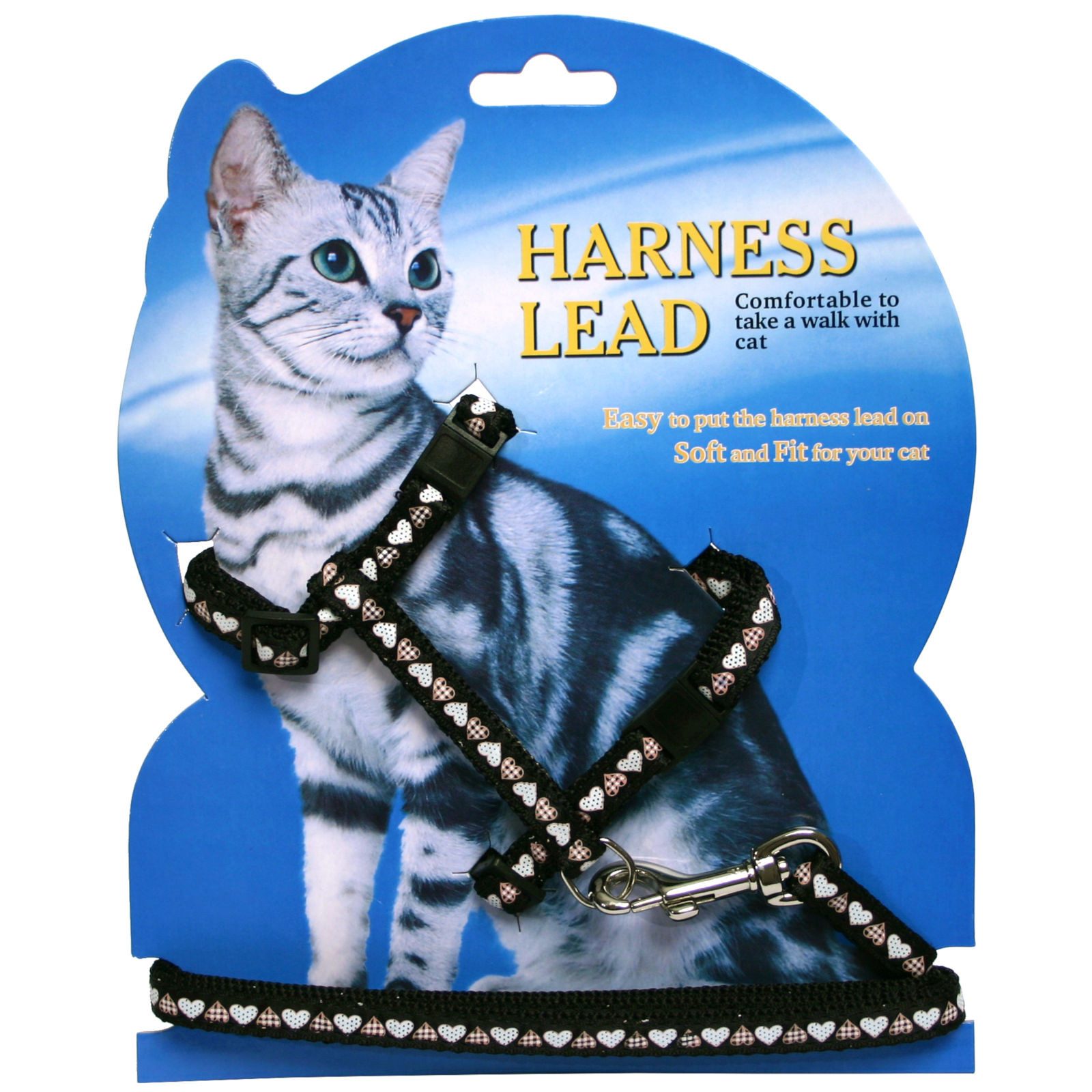 Das praktische Katzengeschirr mit Leine ist ideal für einen schönen Spaziergang mit Ihrem Stubentiger. Es ist leicht anzulegen, stufenlos verstellbar und besitzt zwei Schnappverschlüsse. Die Leine ist 180 cm lang, mit einem Karabiner, das Geschirr ist schwarz mit Herzchenmuster.