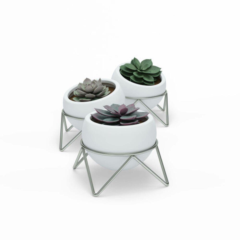 - Die von Designer Sung wook Park für Umbra entworfenen Potsy Tischvasen sind schlicht und modern und zaubern auf dezente Art und Weise einen Touch Grün in ihre Umgebung - Das 3-teilige Übertopfset macht sich sowohl gruppiert als 3er-Set als auch einzeln aufgestellt gut. Potsy ist besonders geeignet für Sukkulenten, Kakteen, Luftpflanzen und Kunstpflanzen. Bringen Sie Abwechslung in den Look und befüllen Sie jeden Potsy Topf mit einer unterschiedlichen Pflanze. Potsy macht sich besonders gut auf dem Esszimmertisch, Couchtisch, der Kücheninsel oder Fensterbank. - Jede Potsy Vase wird von einem geometrischen Metallständer gehalten, der sich leicht verschieben und umstellen lässt. - Potsy’s Übertöpfe können in verschiedene Richtungen geneigt