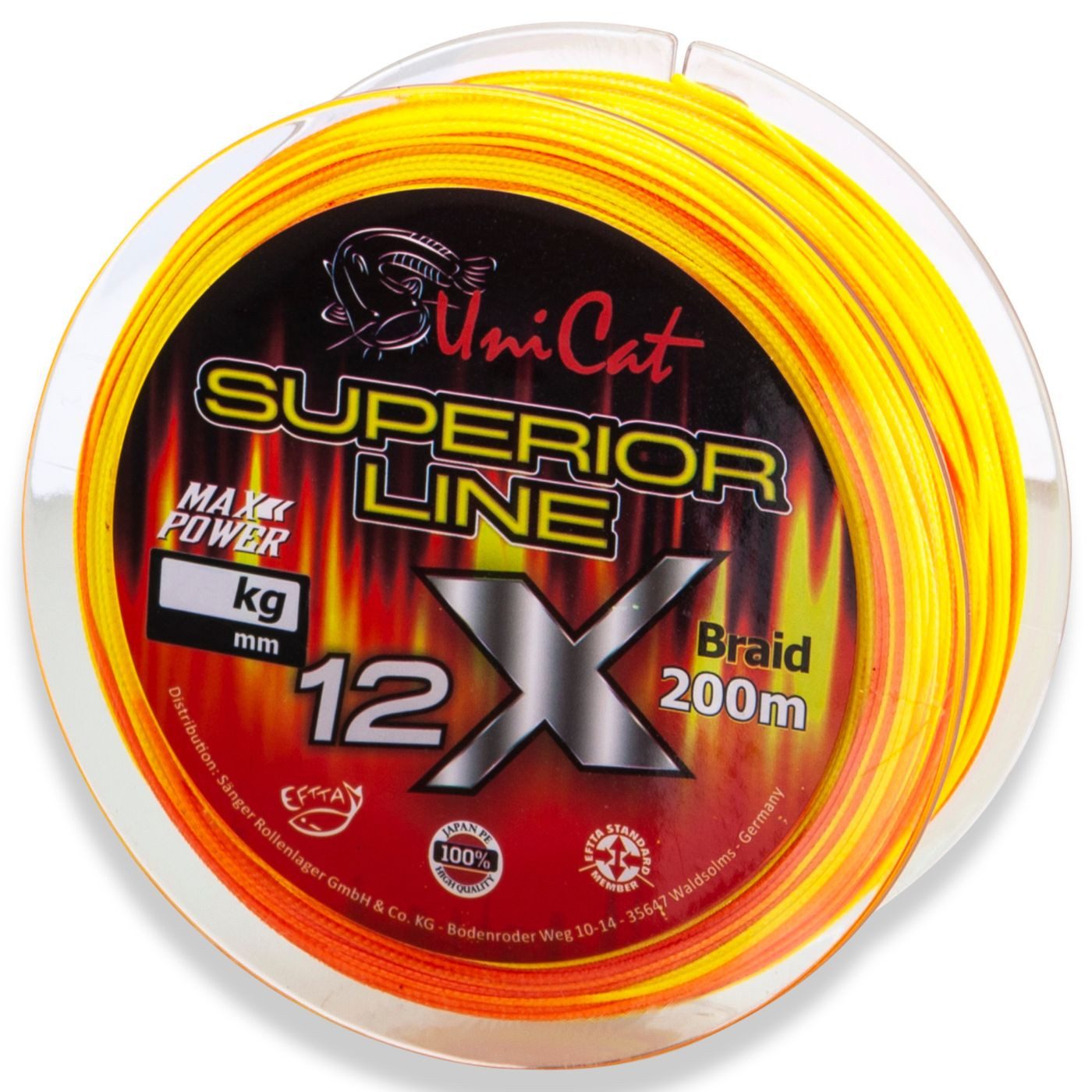 Uni Cat 12X Braid Superior Line - Welsschnur - Die geflochtene Wallerschnur von Uni Cat ist eine sehr gute Geflechtschnur zum aktiven und passiven Welsangeln. Die Angelschnur weist sehr hohe Tragkraftwerte, eine hohe Abriebfestigkeit und eine gute Knotenfestigkeit auf, wodurch sie den hohen Belastungen beim Wallerfischen problemlos standhält und sich kampfstarke Großwelse sicher ausdrillen lassen. Dank der sehr engen und 12-fachen Flechtung nimmt die Welsschnur nahezu kein Wasser auf. Zudem besitzt die geflochtene Angelschnur eine weiche und sehr glatte Oberfläche und aufgrund ihrer Färbung weist sie eine hohe Sichtbarkeit beim Angeln auf Wels auf. Ob zum Distanzangeln mit der Boje, zum Abspannen, U-Posenangeln oder für schweres Spinnfischen und Vertikalangeln, die geflochtene Wallerschnur deckt beim Welsfischen viele Einsatzgebiete ab.