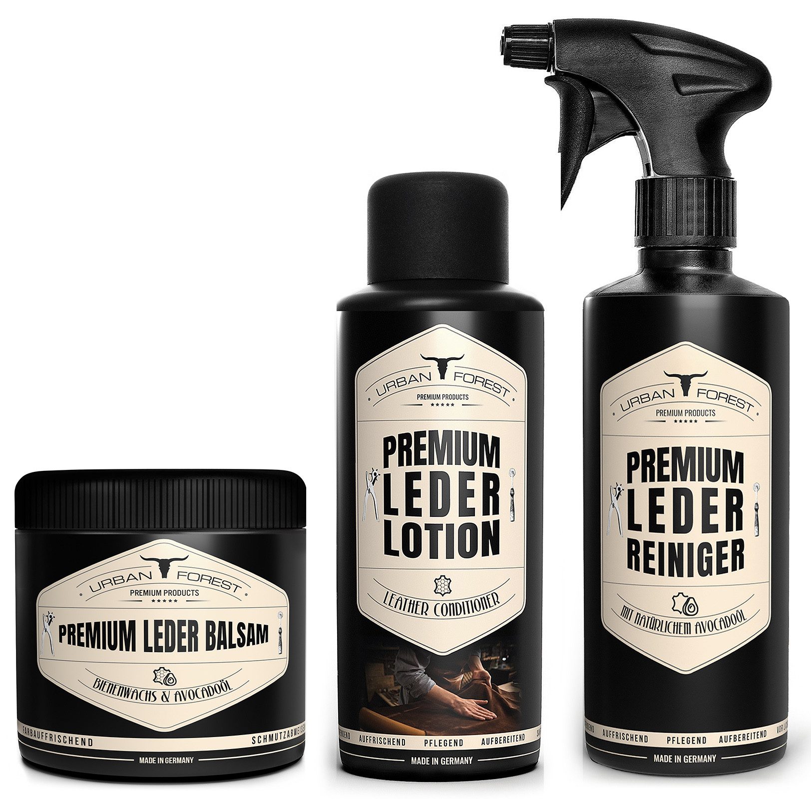 Entdecken Sie die perfekte Harmonie aus Reinigung und Pflege mit dem URBAN FOREST Premium Lederpflege-Set. Dieses exklusive Duo wurde sorgfältig zusammengestellt, um die Schönheit und Langlebigkeit Ihrer Lederprodukte zu gewährleisten. Mit einer 500-ml-Flasche unseres Premium Lederreinigers und einer 500-ml-Dose unseres Premium Lederbalsams und 500-ml-Dose Premium Lederlotion sind Sie bestens ausgerüstet, um Ihrem Leder den bestmöglichen Schutz zu bieten. URBAN FOREST PREMIUM LEDER REINIGER mit natürlichem Avocado-Öl und hergestellt in Deutschland für höchste Ansprüche reinigt, pflegt und spendet Feuchtigkeit, um das Leder aufzubereiten und Leder sowie Lederprodukte aufzufrischen. Dabei wirkt es sanft reinigend, feuchtigkeitsspendend, pflegend und vor Licht schützend. Es riecht angenehm, zieht schnell ein und beinhaltet keine verunreinigenden Farbstoffe. Durch den Einsatz von Avocado-Öl eignet es sich besonders für Glattleder aller Art. URBAN FOREST PREMIUM LEDER-REINIGER MIT TOP-QUALITÄT ist optimal geeignet als Reiniger für sämtliche Glatt- und Kunstlederprodukte wie z.B. als Reiniger für Ledersitze, Reinigungsmittel für Taschen oder Schuhe, als Pflegemittel für Leder oder Autoleder, Leder-Reiniger für Ledergarnituren, Möbel, Reiniger für Sattelzeug, Reiniger für Motorradbekleidung, Lederbekleidung, Hundeleinen oder als Lederpflege für Autos. LEDER-REINIGER ANWENDUNG: Wir empfehlen, den Lederreiniger auf einen Schwamm oder ein dünnes Tuch für Lederpflege aufzusprühen und das Leder durch wischen zu reinigen. Sprühen Sie den Reiniger nicht direkt auf das Leder und testen Sie stets auf unauffälligen Stellen auf Empfindlichkeit. Bei starker Verschmutzung können Sie die Anwendung auch problemlos wiederholen. Tipp: Zur ergänzenden Lederpflege und Lederpolitur empfehlen wir unser Lederbalsam von URBAN FOREST PREMIUM PRODUCTS. Nicht auf Nubuk, Velours, Alcantara-, Wild- und Rauleder anwenden. URBAN FOREST PREMIUM LEDER BALSAM ist optimal geeignet für sämtliche Glattlederprodukte. Als Reinigungsmittel für Taschen oder Schuhe, als Pflegemittel für Leder oder Autoleder, Politur für Ledergarnituren, Möbel, Pflege für Sattelzeug, Motorradbekleidung, Lederbekleidung, Hundeleinen oder Lederpflege Auto. Die Leder Reinigung Auto, Schuhe und Taschen können Sie mit diesem Lederfett genauso durchführen. Nicht auf Nubuk, Velours, Alcantara-, Wild- und Rauleder anwend und bietet natürlichen Lichtschutz, führt zu neuem Glanz, schützt Leder vor Verblassen, Austrocknung, Rissbildung und verlängert die Lebenszeit des Glattleders nachhaltig. Es pflegt und versiegelt Lederjacken, Ledermöbel, Lederschuhe oder Ledertaschen. Das Leder wird weich und geschmeidig. Durch den Einsatz von natürlichem Bienenwachs ist es besonders geeignet als Lederpolitur oder Lederpflege für Glattleder aller Art und ist frei von Harz und Säure. URBAN FOREST PREMIUM LEDER BALSAM wirkt veredelnd, farbauffrischend, wasserabweisend, atmungsaktiv, imprägnierend und schmutzabweisend. Es riecht angenehm und dezent, zieht schnell ein und beinhaltet keine verunreinigenden Farbstoffe. URBAN FOREST PREMIUM LEDER BALSAM ANWENDUNG: Wir empfehlen Ihnen, mit einem Schwamm oder weichen Tuch für Lederpflege das vorab gereinigte Leder dünn und gleichmäßig mit unserem Leder-Balsam als Pflegeprodukt einzureiben. Im nächsten Schritt gut einziehen lassen und ggfs. das Leder mit einem weichen Tuch oder einer weichen Lederbürste nachpolieren. Tipp: Zur Lederreinigung und Lederpflege empfehlen wir unseren Lederreiniger von URBAN FOREST PREMIUM PRODUCTS. URBAN FOREST PREMIUM LEDER LOTION ist optimal geeignet für sämtliche Glattlederprodukte. Als Reinigungsmittel für Taschen, Schuhe oder Schuhzubehör, als Pflegemittel für Leder oder Autoleder, als Reinigungsprodukt zur Polsterreinigung, Motorradbekleidung, Lederbekleidung, Hundeleinen oder Lederpflege Auto. Die Leder Reinigung für das Auto, für die Schuhe und für die Taschen können Sie mit dieser Lederlotion genauso durchführen. Anders als ein Leder-Balsam lässt es sich schneller auf dem Leder verarbeiten, führt aber genauso zu neuem Glanz und schützt vor Austrocknung. Auch die imprägnierenden Eigenschaften von einem Imprägnierspray hat diese Leder-Pflege-Lotion. Es ist besonders geeignet zur Leder-Aufbereitung, als Lederpolitur oder Lederpflege für Glattleder aller Art und ist frei von Harz und Säure. Es ist farblos und dadurch für alle Farben von Leder oder Kunstleder geeignet. Diese leistungsstarke Leder-Lotion wurde nach höchsten Standards und für höchste Ansprüche in Deutschland hergestellt. Es reinigt, pflegt und spendet Feuchtigkeit, um das Leder aufzubereiten und optimalen Schutz für Leder und Lederprodukte zu verleihen. Dabei ist es als Leder Creme ebenso einsetzbar wie als Leder- & Polsterreiniger. Es riecht angenehm und dezent, zieht schnell ein und beinhaltet keine verunreinigenden Farbstoffe. LEDER LOTION ANWENDUNG: Wir empfehlen Ihnen, mit einem Schwamm oder weichen Tuch für Lederpflege das vorab gereinigte Leder dünn und gleichmäßig mit unserer Leder-Lotion als Pflegeprodukt einzureiben. Im nächsten Schritt gut einziehen lassen und ggfs. das Leder mit einem weichen Tuch oder einer weichen Lederbürste nachpolieren. Den Vorgang alle 4 Wochen wiederholen. Nicht auf Nubuk, Velours, Alcantara-, Wild- und Rauleder anwenden. Tipp: Zur Lederreinigung und Lederpflege empfehlen wir unseren Lederreiniger von URBAN FOREST PREMIUM PRODUCTS. PREMIUM LEDERPFLEGE von URBAN FOREST