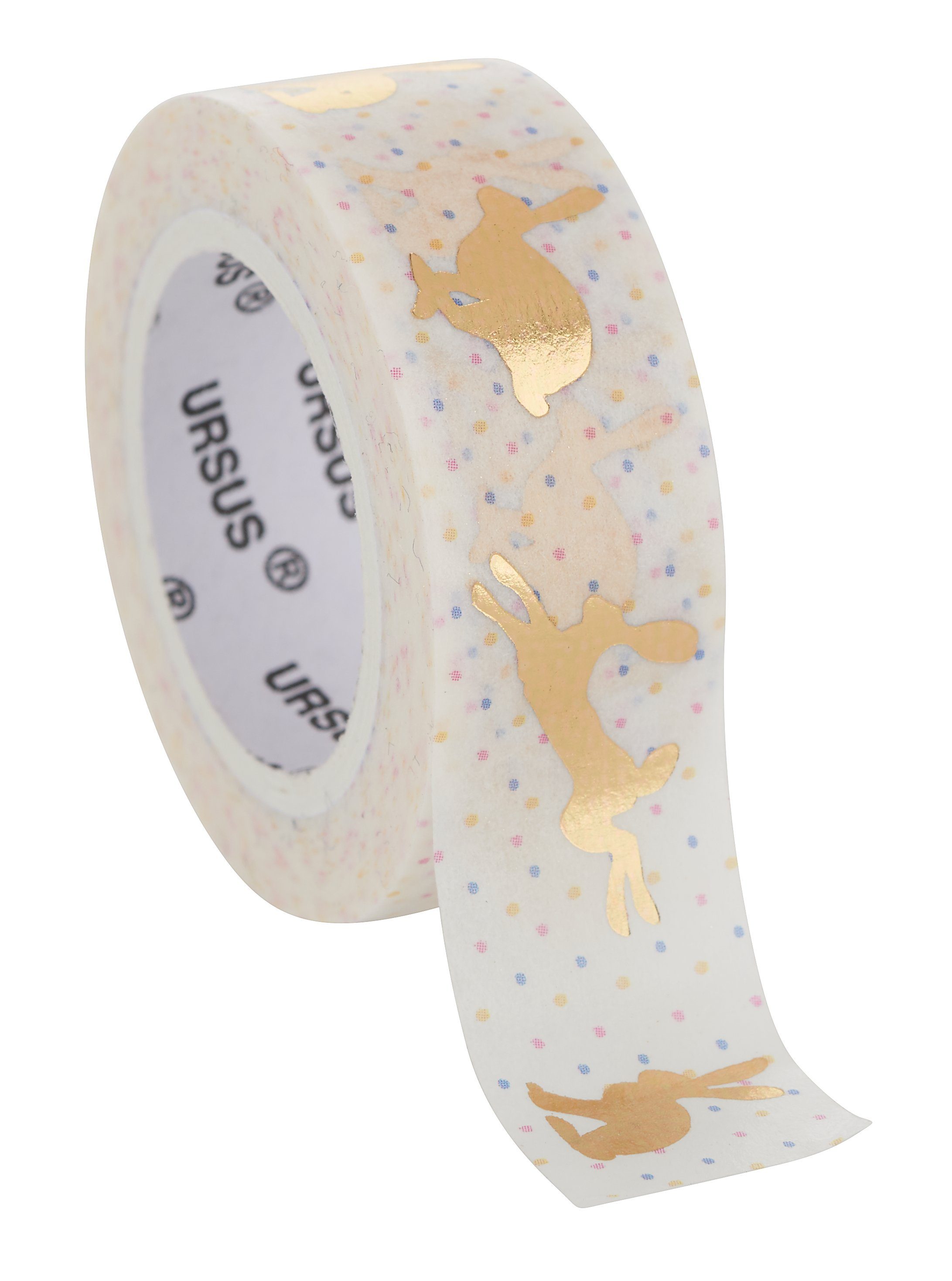 Das Masking Tape ist veredelt mit einem Heißfoliendruck in Gold und ca. 15 mm breit und 10 m lang. Ein selbstklebendes Band aus Papier mit feinen, bunten Punkten und einem Hasen, der einmal sitzt, springt oder hoppelt. Eine schöne Gestaltungsmöglichkeit für Geschenkkarten, Einladungskarten oder Tischkarten in der Osterzeit.