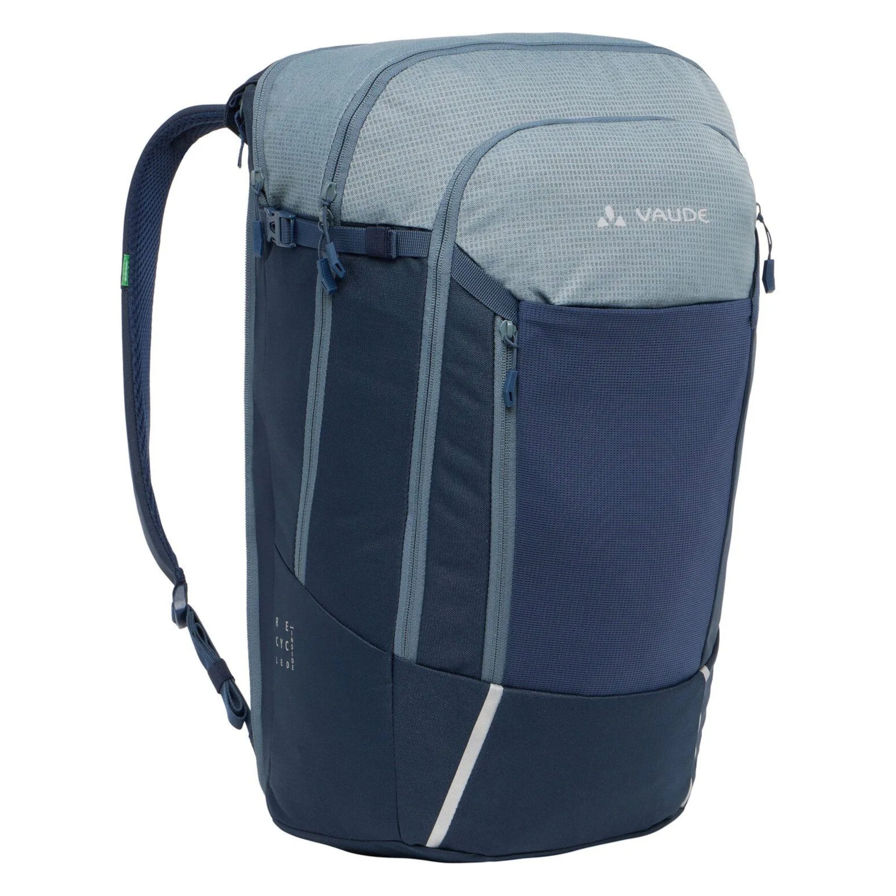 Rucksack oder Radtasche? Beides! Der Cycle 20 ist der ideale Begleiter für Commuter, die während der Fahrt einen sicheren Sitz der Tasche am Rad wünschen, sie dann aber in Bahn und Bus oder der Uni als Rucksack tragen möchten. Die Tasche wird über die mit einem Schloss absperrbaren QMR-Haken (z. B. TSA-Schloss, nicht im Lieferumfang enthalten) am Gepäckträger befestigt und ist im Handumdrehen zum Rucksack umgebaut. Dazu werden die beiden vertikalen Reißverschlüsse geöffnet und das gesamte Befestigungssystem in einem mit Klett verschlossenen Fach verstaut. Die Umbaufunktion wird auf einem eingenähten, leicht entfernbaren Etikett in wenigen Schritten erläutert. Die clevere Rucksack-Radtaschen-Kombination bietet aber noch mehr. Im großen Hauptfach mit Platz für DIN A4 Unterlagen hilft ein mit Reißverschluss zu schließender Netz-Organizer für Kleinutensilien dabei, Ordnung zu halten. Ein separates, mit Reißverschluss verschlossenes, gepolstertes Fach nimmt Laptops bis 15,6"" auf. Auf der Front befindet sich eine flache Netztasche für das schnelle Verstauen von Zeitschriften oder nasser Kleidung. Ein Helmhalter sowie ansprechend ins Design integrierte reflektierende Elemente runden die Komfortausstattung ab. Das Hauptmaterial des Cycle besteht aus 50 % recyceltem Polyester, das Kontrastmaterial sogar zu 100 %. Unser Verwandlungskünstler ist mit EcoFinish PFC-frei wasserabweisend ausgerüstet. Das VAUDE Green Shape-Label steht für ein umweltfreundliches, funktionelles Produkt aus nachhaltigen Materialien.