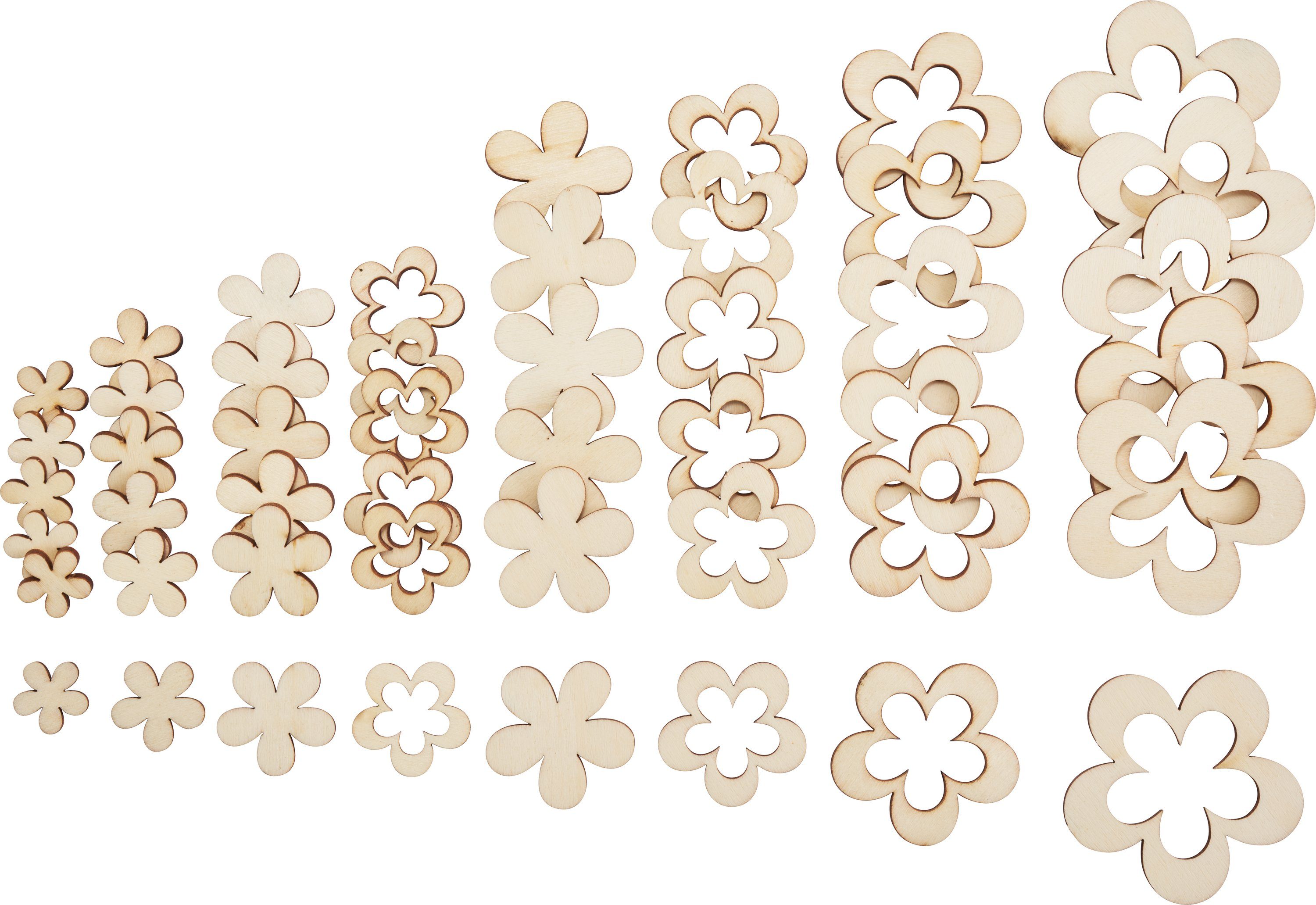 VBS Streuteile Blüte 'Yolli', 48 Stück in verschiedenen Größen von ca. 1,5 – 4,7 cm und in zwei Ausführungen. Die Stärke liegt bei ca. 2,5 mm und das Material ist gelasertes Holz, sodass es produktionsbedingt zu leichten Brandspuren an den Kanten kommen kann. Für frühlingshafte Dekorationen in Gestecken, Kränzen, Sträußen und Deko-Ringen sowie für die Grußkartengestaltung, Geschenkverpackungen, Windlichter und vielem mehr geeignet. Zusätzlich können die schlichten Holzstreuteile mit Bastelfarben, Glitter, Brandmalerei und Handlettering individuell verziert werden. Trockenblumen, Schleifenband, Kunstblumen, Anhänger und weitere Streuteile schaffen mit wenigen Handgriffen eine hübsche Dekoration für den Frühling und eine tolle Geschenkidee.