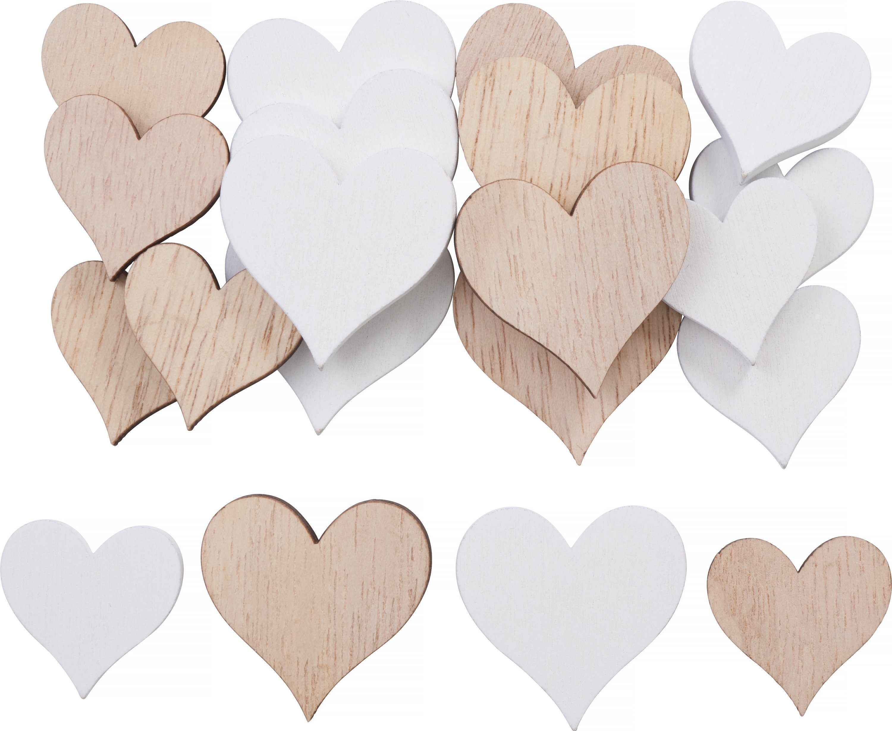 VBS Streuteile Herzen 'Marum', 20 Stück aus Holz mit einer Größe von ca. 2,7–3,5 cm und einer Stärke von ca. 4,6 mm. In Natur und Weiß bemalt und in zwei verschiedenen Größen je Farbe. Perfekt für romantische Dekorationen in Kränzen und Gestecken, auf dekorierten Tabletts oder für die Grußkartengestaltung sowie Geschenkanhänger. Die schlichten Herzen können mit Stiften, Farbe und Brandmalerei personalisiert werden.