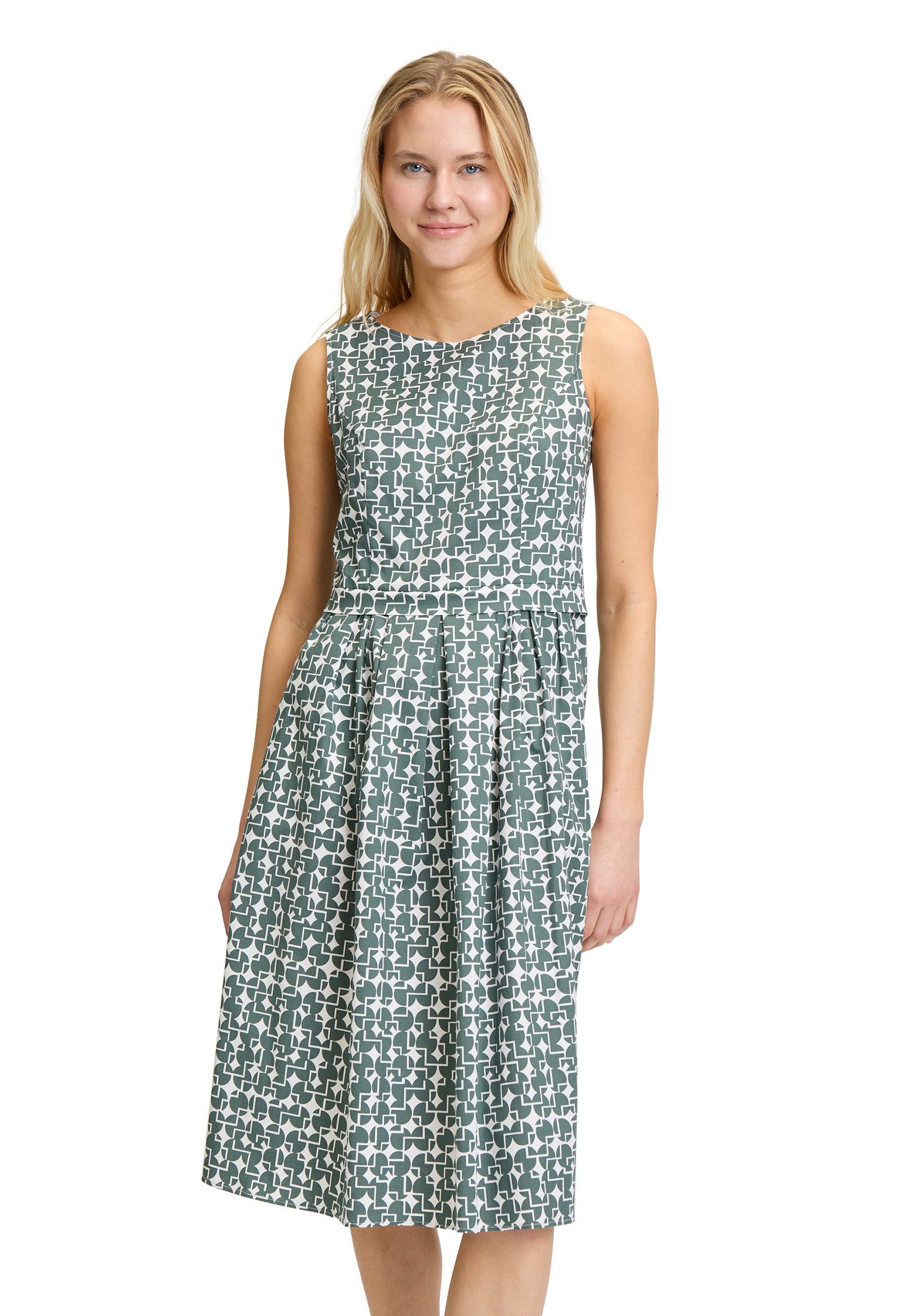 Dieses modische Highlight ist ein echtes Must-have für den Sommer! Das ärmellose Sommerkleid besticht durch sein feminines Design mit grafischem Muster und einem eleganten Rundhalsausschnitt. Der taillierte Schnitt und die feinen Falten verleihen dem Kleid eine charmante Silhouette. Hergestellt aus einer leichten Baumwoll-Mischung, bietet es höchsten Tragekomfort. Praktische Details wie der Reißverschluss und die Nahttaschen machen es zum perfekten Begleiter für stilvolle Auftritte.