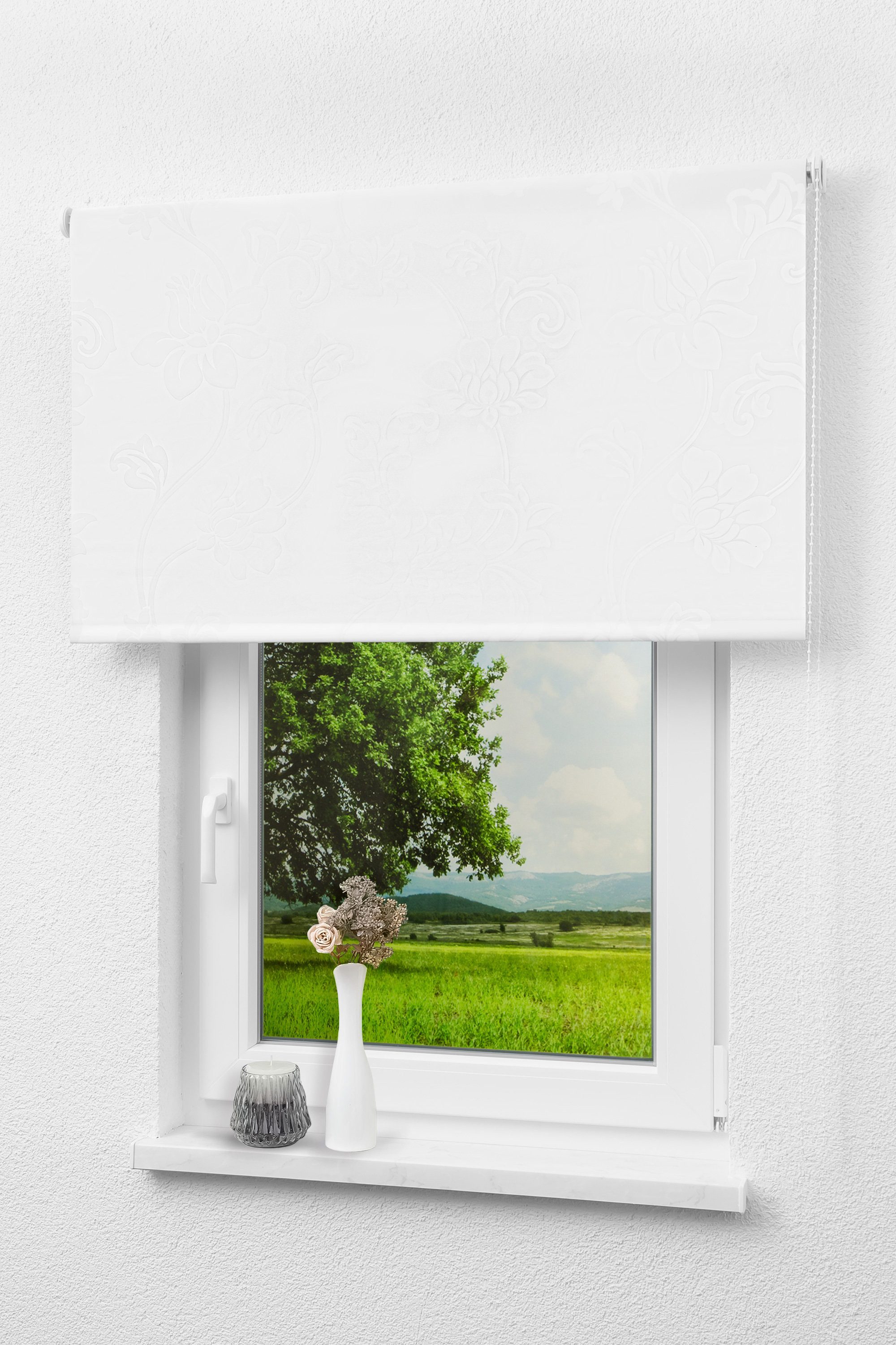 Schlicht und hintergründig, trotzdem angenehm ist die Wirkung, wenn das florale Design fast die Farbe des Stoffes annimmt. Weiß fängt diese Helligkeit und Klarheit perfekt ein. Das Gesamtbild wird natürlich und auf eine stille Art ausgelassen. Das Rollo passt perfekt in klassische Einrichtungen. Rustikale Wohnaccessoires betonen dagegen seine natürliche, nahbare Seite. In Verbindung mit dunklen Dekoren erzeugt das hochwertige Weiß einen edlen Eindruck..