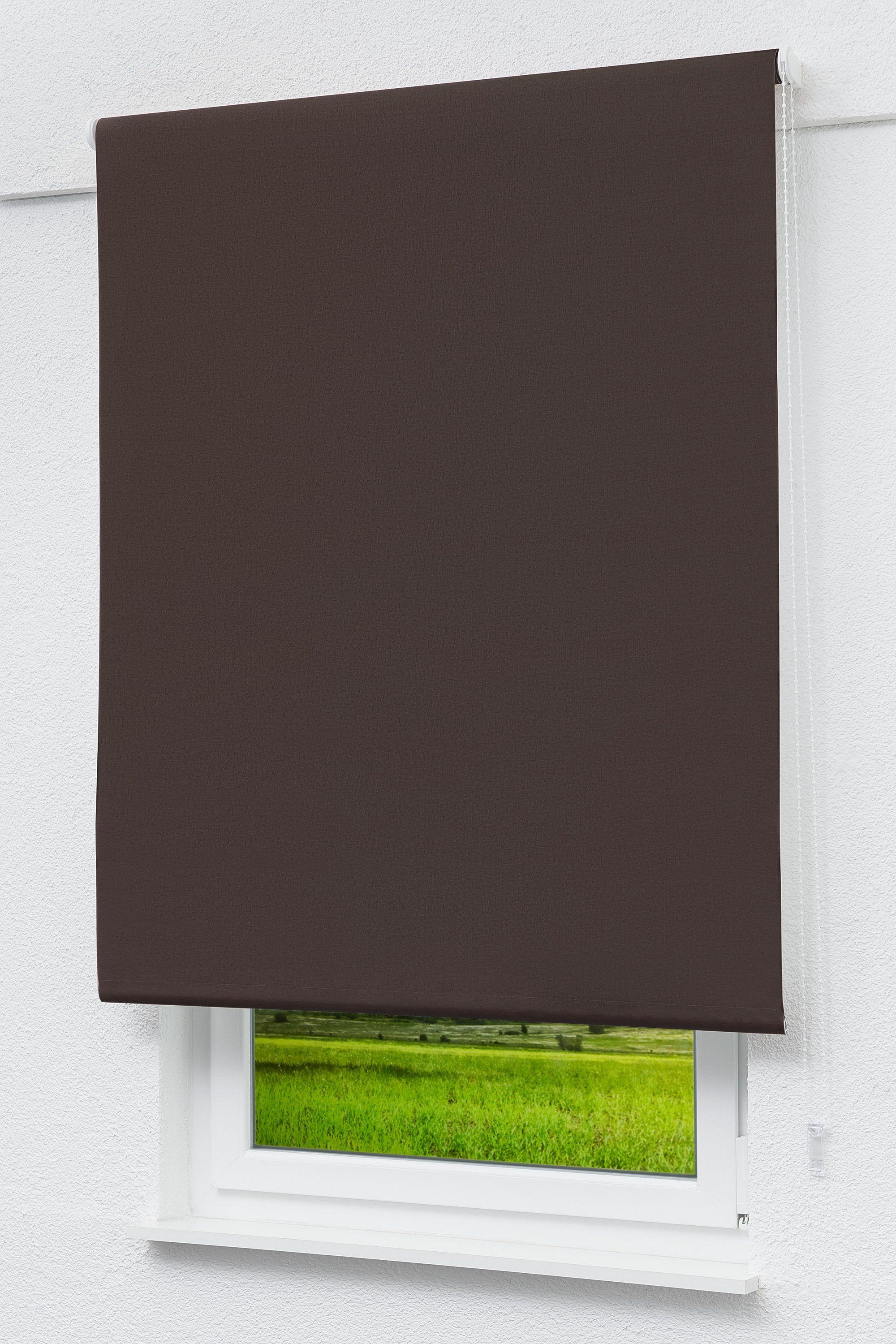 Der dunkle Braunton wirkt ruhig aber freundlich und warm. Er kann helle Farben schön ergänzen und ist ein guter Partner für helles Blau oder sanftes pastellrosa. Die beschichtete Rückseite macht das Rollo lichtdicht und beugt zu starkem Erwärmen des Raumes durch Sonnenlicht vor..