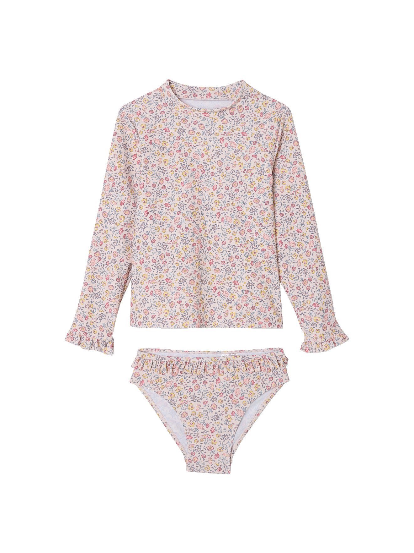 Schnelltrocknender Stretch Badeshirt: Lange Raglanärmel mit Rüschen. Blument, allover bedruckt. Badehose: Blument, allover bedruckt. Rüschen am Bund.