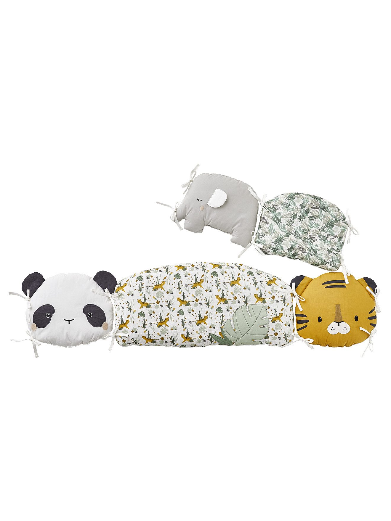 Halbe Bettumrandung: 5 Polster, davon 1 großes für die Kopfseite Komplette Bettumrandung: 10 Polster, davon 2 größere (1 für die Kopfseite, 1 für das Fußende) Polster in Tiger-, Panda- und Elefantenform Polster mit Druckmotiven und Stickereien Befestigung an den Gitterstäben mit Bändern Befestigung in beliebiger Reihenfolge