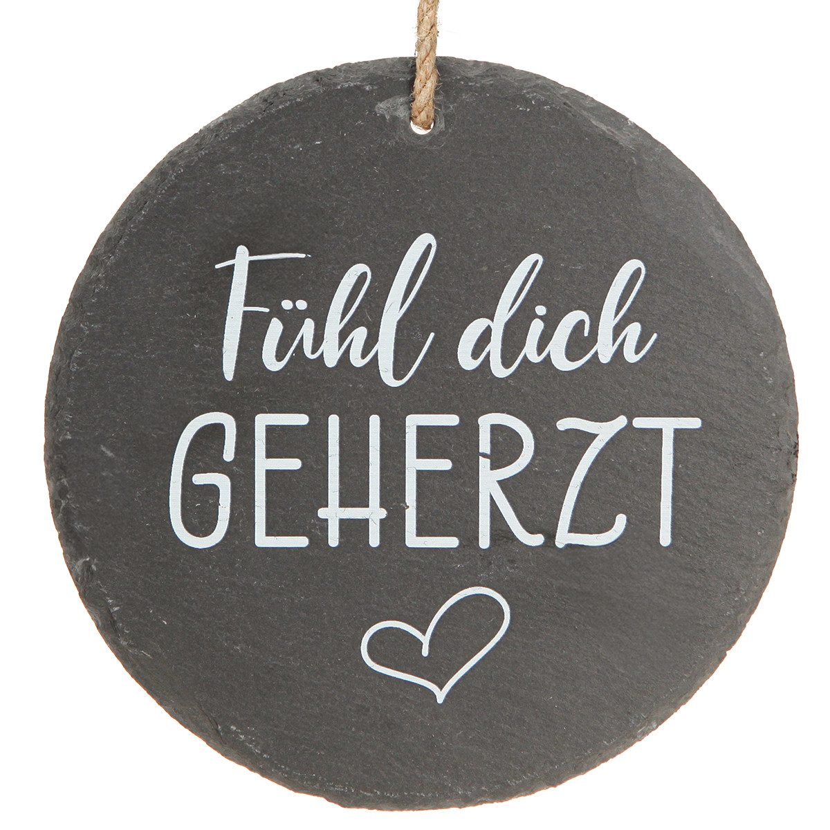 Diese elegante Schieferplatte mit einem Durchmesser von 20 cm ist der ideale Hingucker für Ihr Zuhause. Dank des schwarzen Schiefers und der weißen Beschriftung strahlt sie zeitlose Eleganz aus und passt perfekt zu verschiedenen Wohnstilen wie Modern, Landhaus oder Shabby Chic. Mit der natürlichen Jutekordel lässt sie sich einfach anbringen und sorgt für ein warmes, einladendes Ambiente.