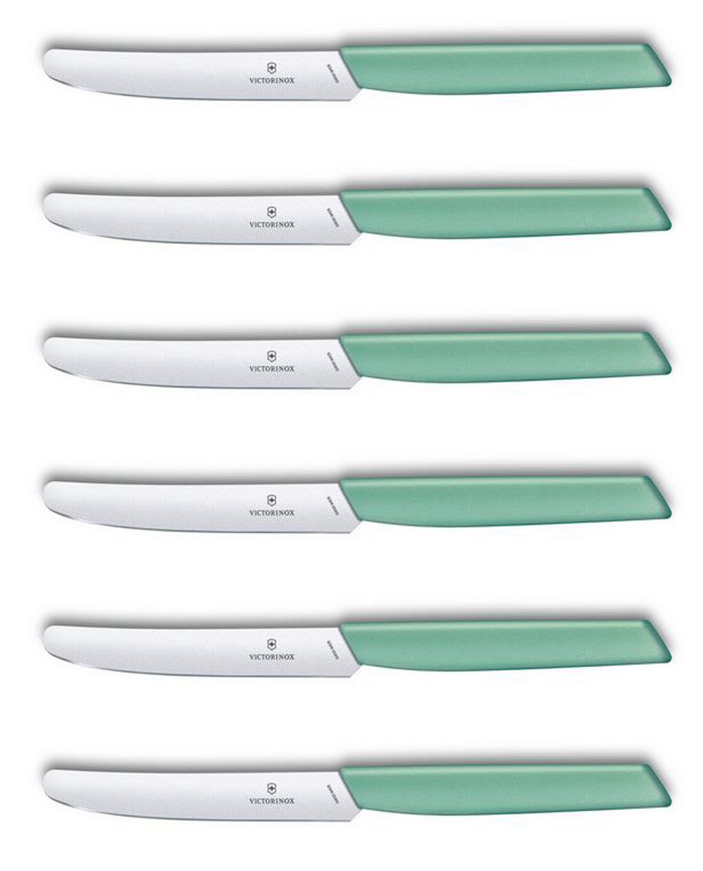 Aus rostfreiem Stahl mit geradem Schliff Das Messer bietet die perfekte Kombination von Form und Funktion. Es verleiht Ihrem gedeckten Tisch einen modernen Twist. Die extra scharfe Klinge aus widerstandsfähigem, rostfreiem Stahl schneidet mühelos Obst und Gemüse, der rutschfeste Griff liegt gut in der Hand. Die Farben reichen von klassischem Schwarz bis zu zarten Pastelltönen – damit ist das Swiss Modern Tafelmesser perfekt für design-affine Hobbyköche.