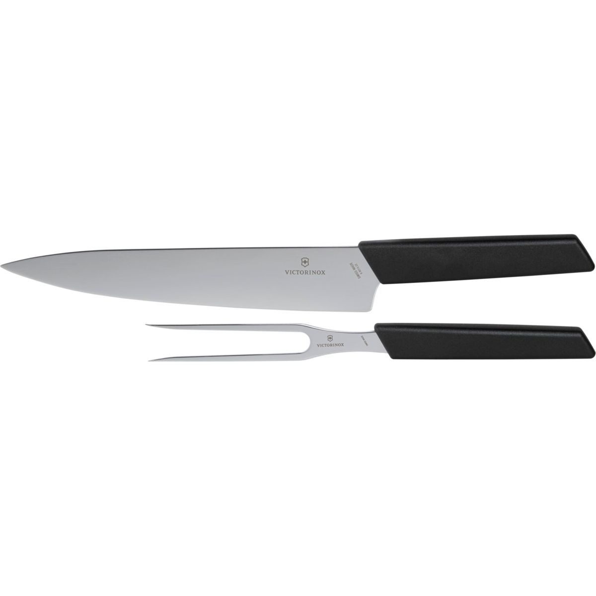 Wo Ästhetik auf höchste Qualität trifft: Entdecken Sie unser 2-teiliges Swiss Modern Tranchier-Set. Wie alle Produkte dieser Kollektion sind die Tranchiergabel und das Messer ergonomisch gestaltet und bieten maximalen Komfort. Die Gabel mit ihren zwei Zinken fixiert den Braten sicher, während die gerade geschliffene Edelstahlklinge des Messers mühelos durch jedes Fleischstück gleitet. Das Set mit seinen glatten Kunststoffgriffen liegt perfekt in der Hand und macht das Tranchieren zu einer leichten Aufgabe.