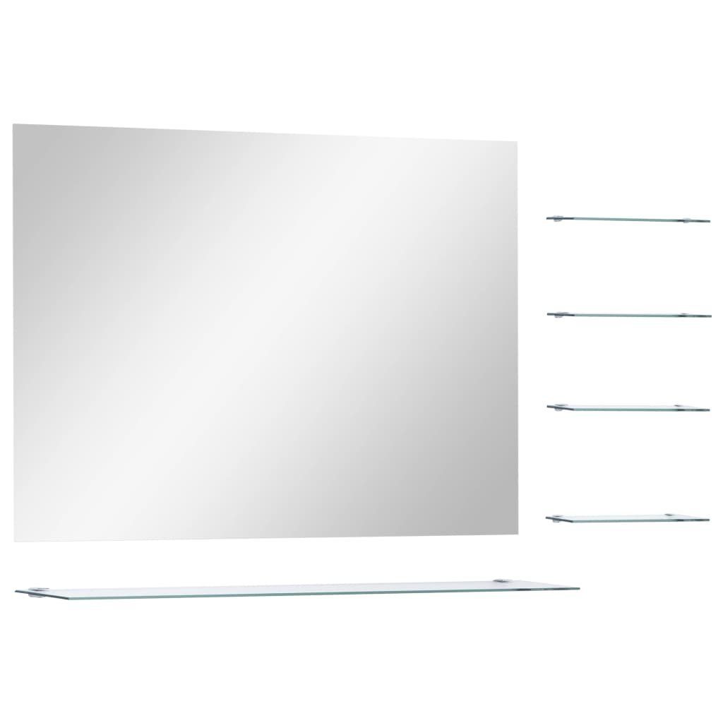 Der Wandspiegel mit Regalen ist elegant gestaltet. Er ist eine praktische und zugleich dekorative Ergänzung für Ihr Badezimmer, Wohnzimmer oder Schlafzimmer. Dieses aus hochwertigem Hartglas gefertigte Badmöbel ist langlebig und leicht zu reinigen. Der rechteckige, gerahmte Spiegel im minimalen und zeitgenössischen Design wertet jeden Raum auf, während vier kleine Ablagen und eine große Ablage zusätzlichen Stauraum bieten. So lassen sich Dekoartikel und Notwendiges übersichtlich und ordentlich aufbewahren. Dieser Spiegel ist einfach zu montieren.