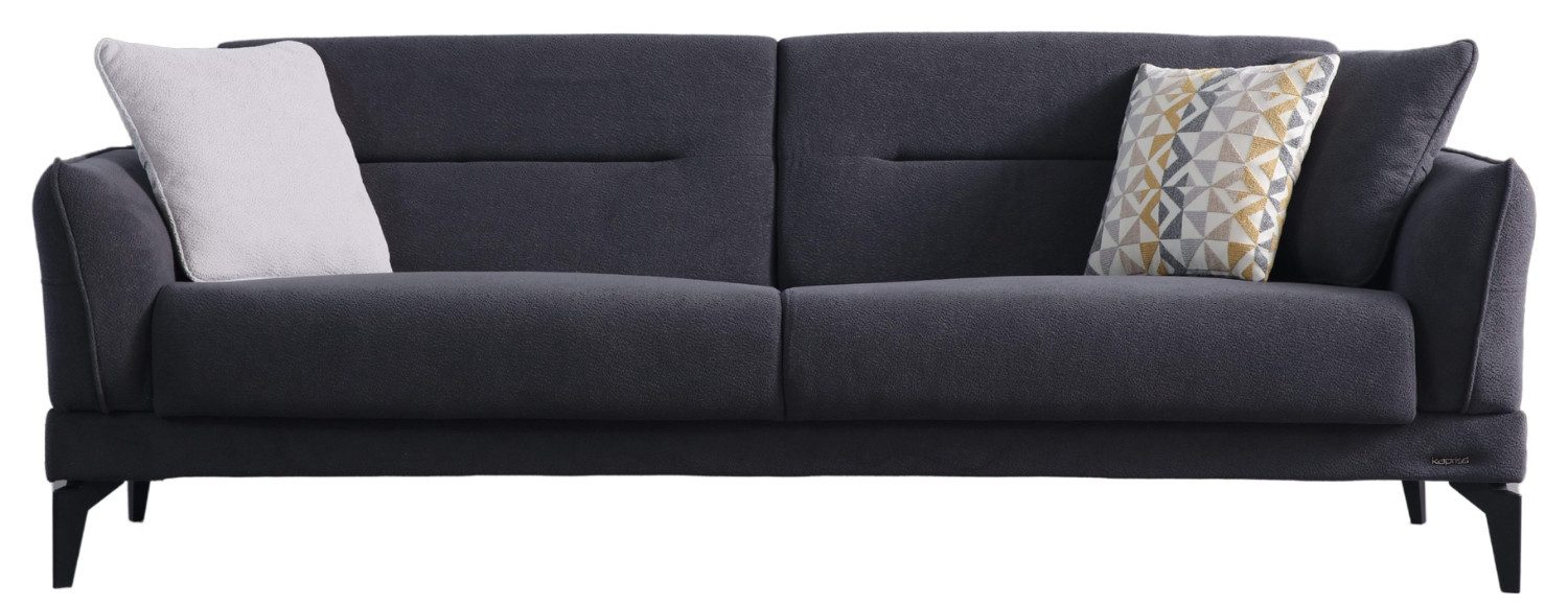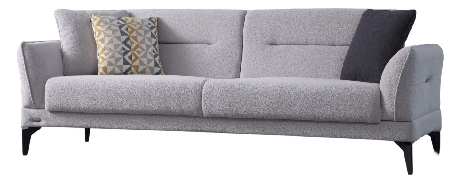 Das Dolcezza Sofa besticht durch seinen weichen Bouclé-Stoff in Anthrazit oder Hellgrau, der eine gemütliche und moderne Atmosphäre schafft. Die dezenten, schwarzen Kunststofffüße verleihen dem Sofa Stabilität und unterstreichen das schlichte, elegante Design.
