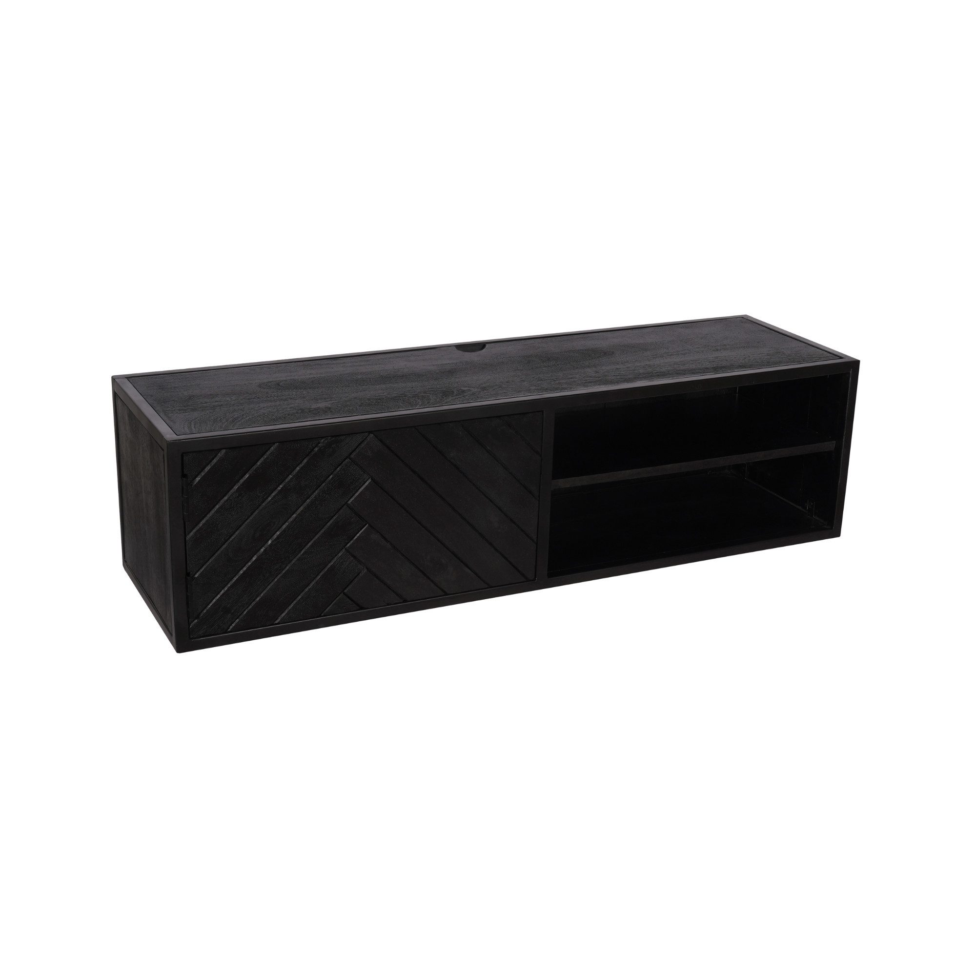 Dieses TV-Lowboard verbindet traditionelle Möbelhandwerkskunst mit einer ausdrucksstarken Optik, die seit jeher in hochwertigen Holzmöbeln geschätzt wird. Gefertigt aus sandgestrahltem Mangoholz in einem tiefen Schwarzton, besticht das Modell durch seine charaktervolle Oberfläche und das edle Fischgräten-Design, das der Front eine klassische, hochwertige Struktur verleiht. Die diagonal verlaufenden Holzsegmente erzeugen ein ruhiges, geordnetes Bild, das sich harmonisch in verschiedenste Einrichtungsstile einfügt.