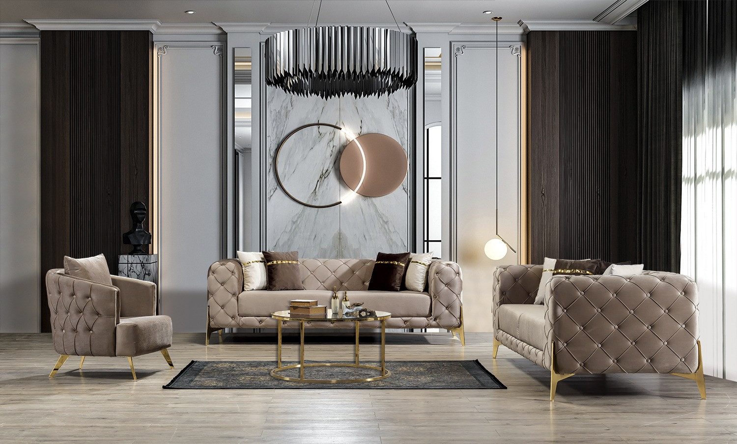 Die Qualität der Verarbeitung zeigt sich nicht nur im Design, sondern auch in der Langlebigkeit des Sets. Jedes Detail wurde mit größter Präzision gefertigt, um sicherzustellen, dass dieses Sofa-Set nicht nur optisch beeindruckend ist, sondern auch den täglichen Anforderungen standhält.