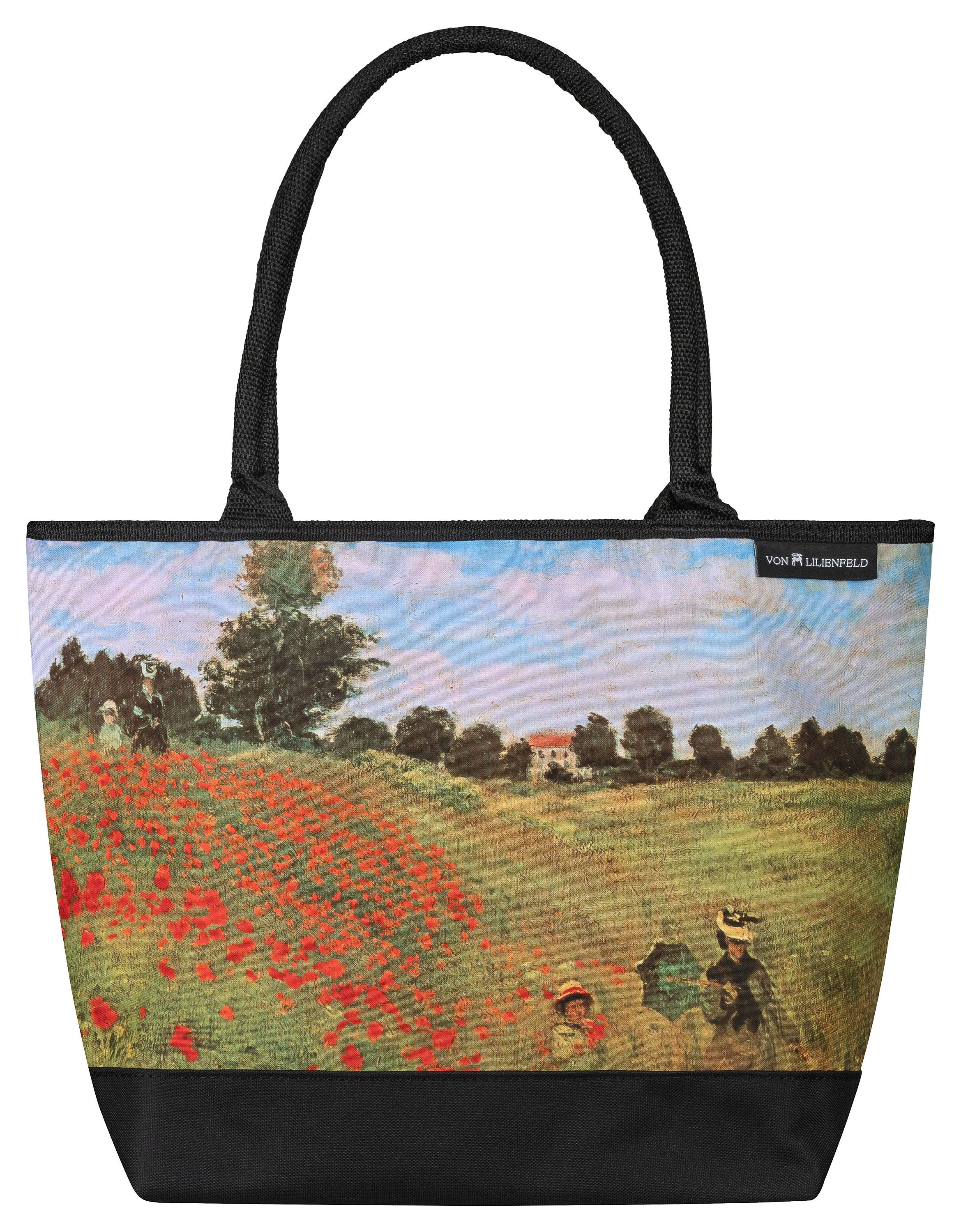 Eine elegante Dame mit Sonnenschirm und Sonnenhut, ein Blumen pflückendes Kind beim sommerlichen Spaziergang durch das Mohnblumenfeld. Sanfte Hügel, Bäume, im Hintergrund ein Gutshaus, darüber der helle Sommerhimmel. Das Motiv dieser Tasche, leicht, fast flüchtig hingetupft, erweckt romantische Sehnsüchte nach Sommer, Sonne, Ferien und der Leichtigkeit des Seins. Auf der unbedruckten schwarzen Rückseite befindet sich zusätzlich auch eine kleine Reißverschluss-Tasche. Material: strapazierfähiges Polyester (100 %) mit einseitigem Kunstdruck im Spezialverfahren, hohe Farbbrillanz Größe: 30 cm x 42 cm Grifflänge ca. 45 cm Die Tasche hat zwei Innenfächer - Maße ca. 14 cm x 14 cm, auf der Rückseite befinden sich zwei Außenfächer - Maße ca. 22 x 13 cm