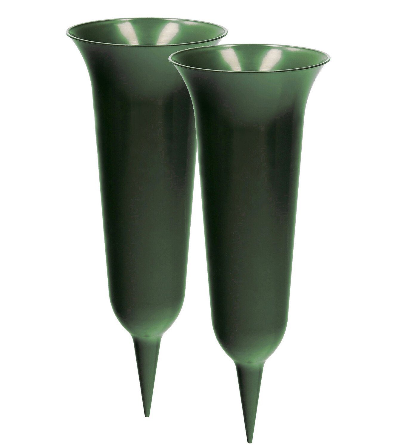 Der lange Erdspieß sorgt für einen sicheren Stand. Die klassische Grabvase kann jederzeit auf dem Friedhof eingesetzt werden. Außerdem ist die Vase darüber hinaus flexibel einsetzbar, denn diese kann auch als Blumenvase im Garten oder auf der Terasse eingesetzt werden. Lieferumfang: 4 x Grabvase. Material: Kunststoff. Maße: ca. 30 x 12 cm (gesamt). Höhe: ca. 23,5 cm (Vase), ca. 6,5 cm (Erdspieß). Farbe: grün.