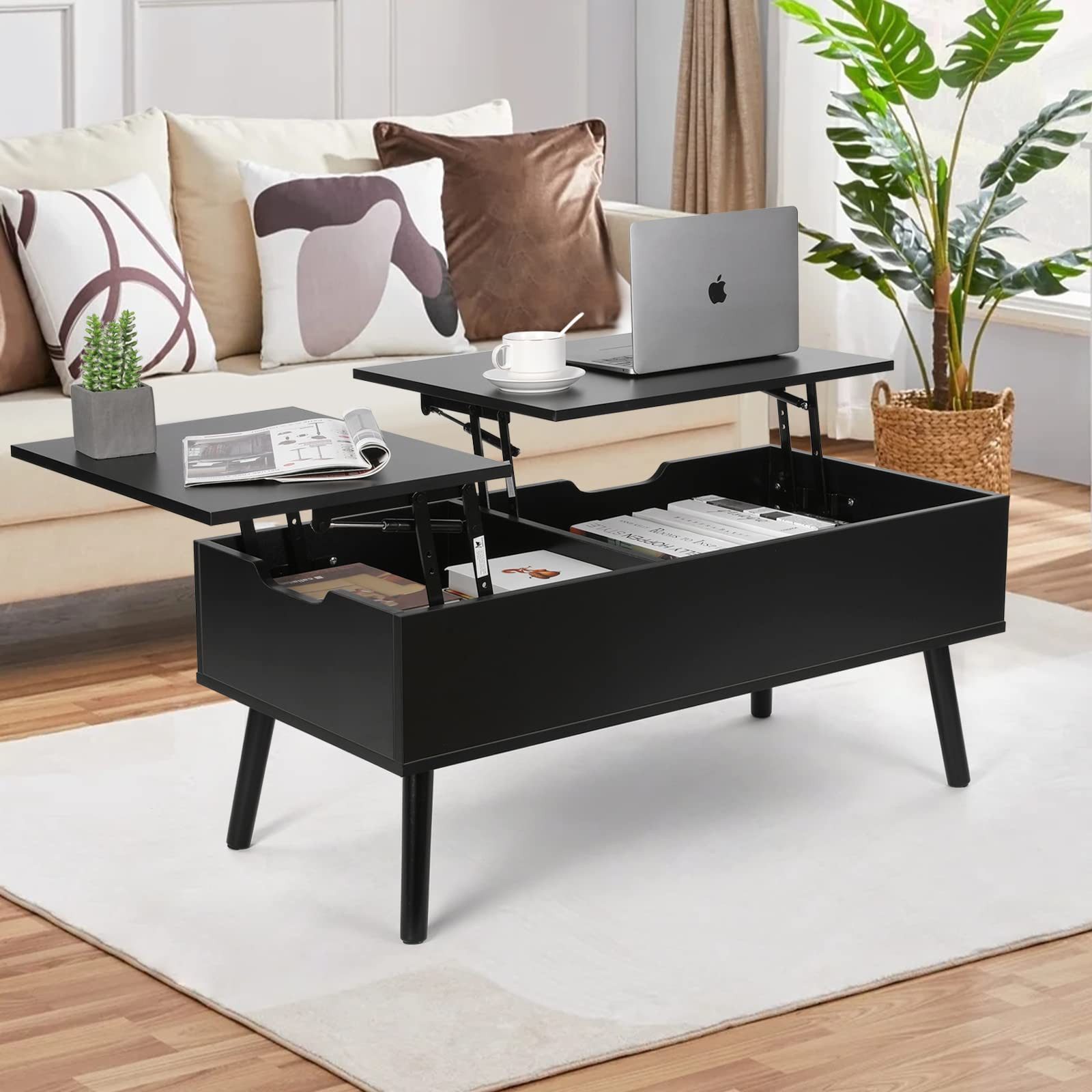 Der hochklappbare Couchtisch ist mit separaten, versteckten Ablagefächern ausgestattet, damit Sie Ihre Alltagsgegenstände geordnet und sauber aufbewahren können. Sie können Ihr Wohnzimmer dekorieren und Ihre Sachen auf innovative Art und Weise aufbewahren.