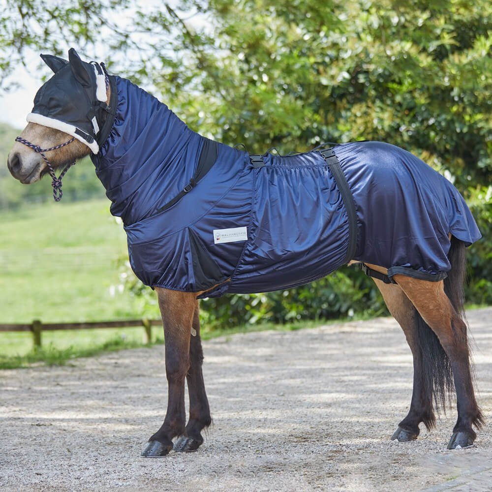 Die Decke mit fixiertem Halsteil und breiten Bauchlatz bietet Rund-um-Schutz vor lästigen Insekten und UV-Strahlen. Zusätzlich kann die Waldhausen Ekzemerdecke mit Hilfe der Elastikgurte mit Schnellverschluss an den Beinen fixiert werden. Dadurch sitzt sie wie ein Anzug.