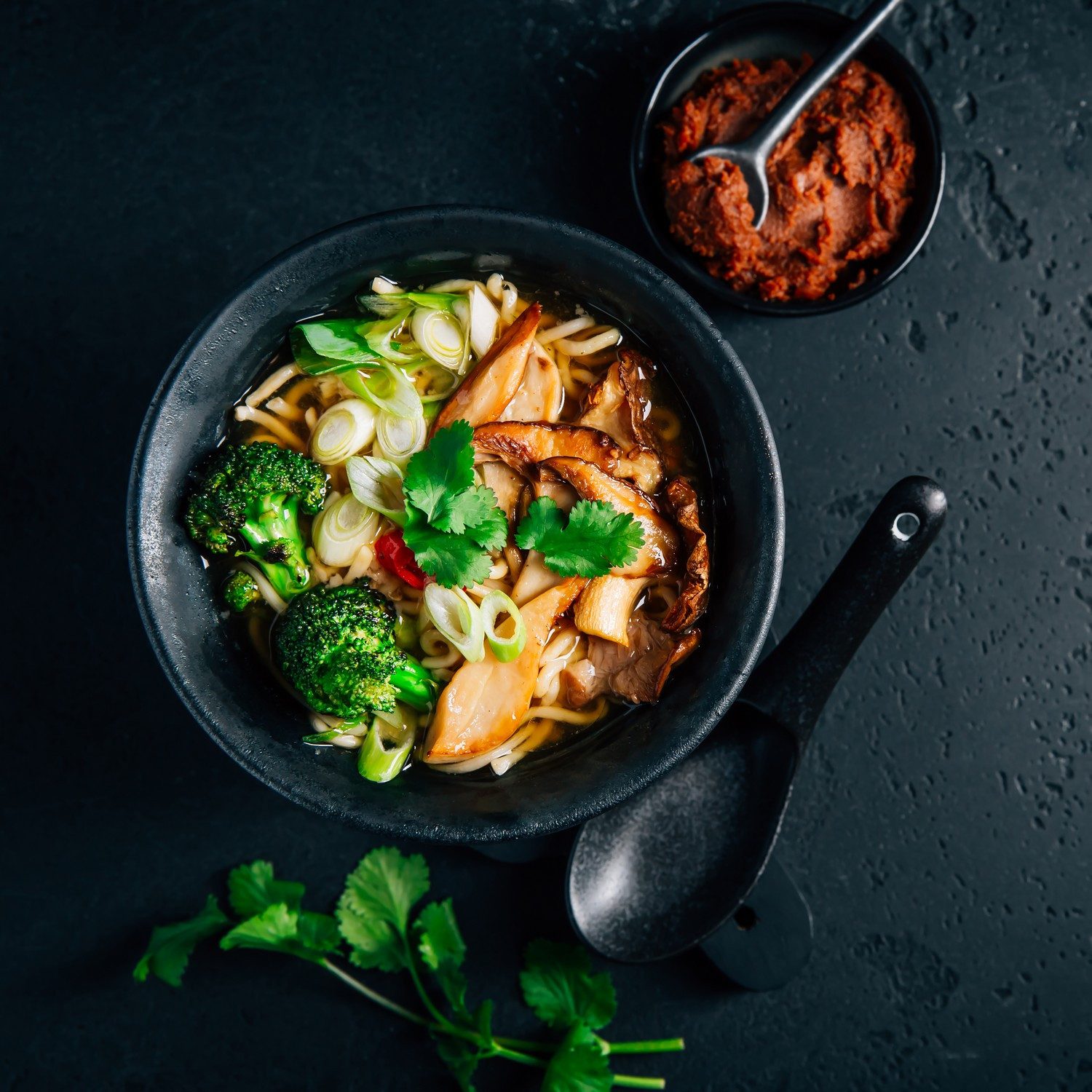 Eine dampfende Schüssel mit aromatischer Nudelsuppe präsentiert sich mit frischem Gemüse, zarten Fleischstücken und würzigen Kräutern. Brokkoli, Frühlingszwiebeln und Koriander verleihen dem Gericht Farbe und Frische. Ein kulinarisches Highlight der asiatischen Küche.