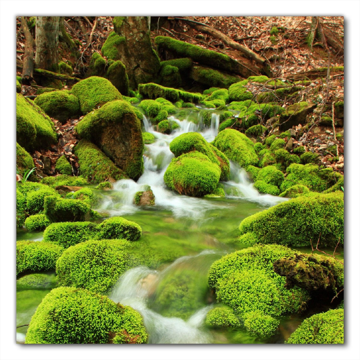Ein kleiner beschaulicher Bachlauf zieht ruhig und beschaulich seinen weg durch den Wald. Klares Wasser fließt über moosige Steine hinunter ins Tal. Saftige Grüntöne verleihen diesem Motiv Ruhe, um Ihre Energie wieder aufzuladen.