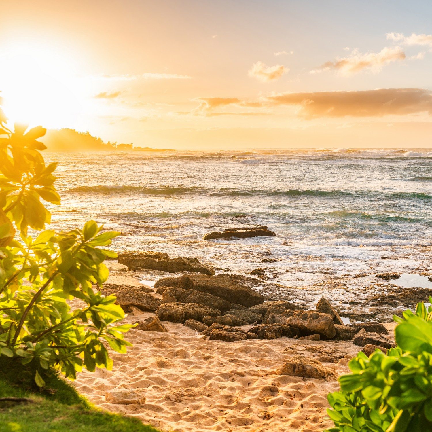 Die Sonne steigt am Horizont auf und taucht die tropische Küste in warmes Licht. Sanfte Wellen treffen auf sandige Ufer und Felsen, während sattgrünes Blattwerk den Ausblick einrahmt. Eine Szene voller Ruhe, Wärme und Sehnsucht nach dem perfekten Moment am Meer.