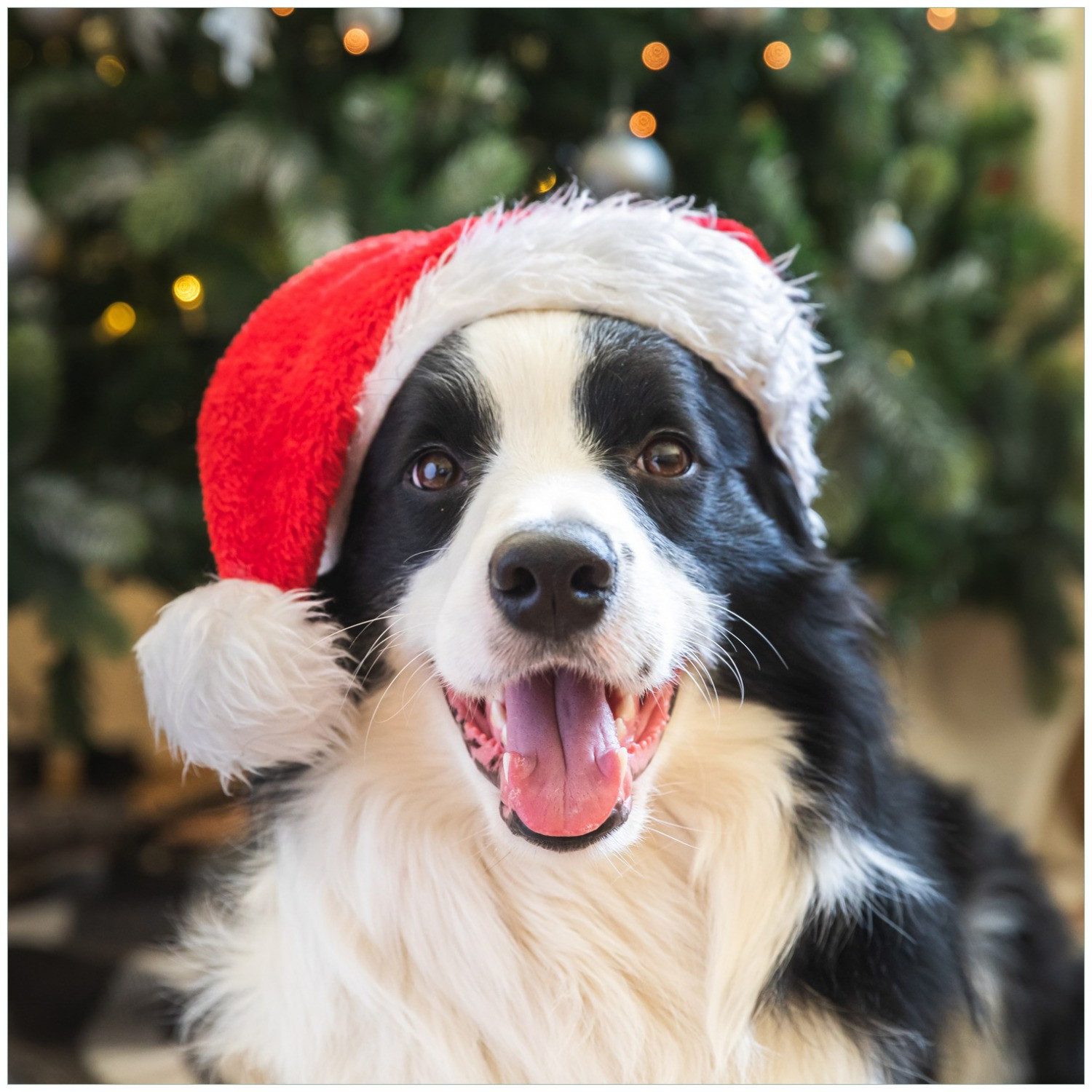 Ein fröhlicher Border Collie sitzt vor einem festlich geschmückten Weihnachtsbaum und trägt eine rote Nikolausmütze. Mit aufmerksamen Augen und einem breiten Hundelächeln verbreitet er pure Festtagsstimmung ? ein herzerwärmender Moment tierischer Weihnachtsfreude.