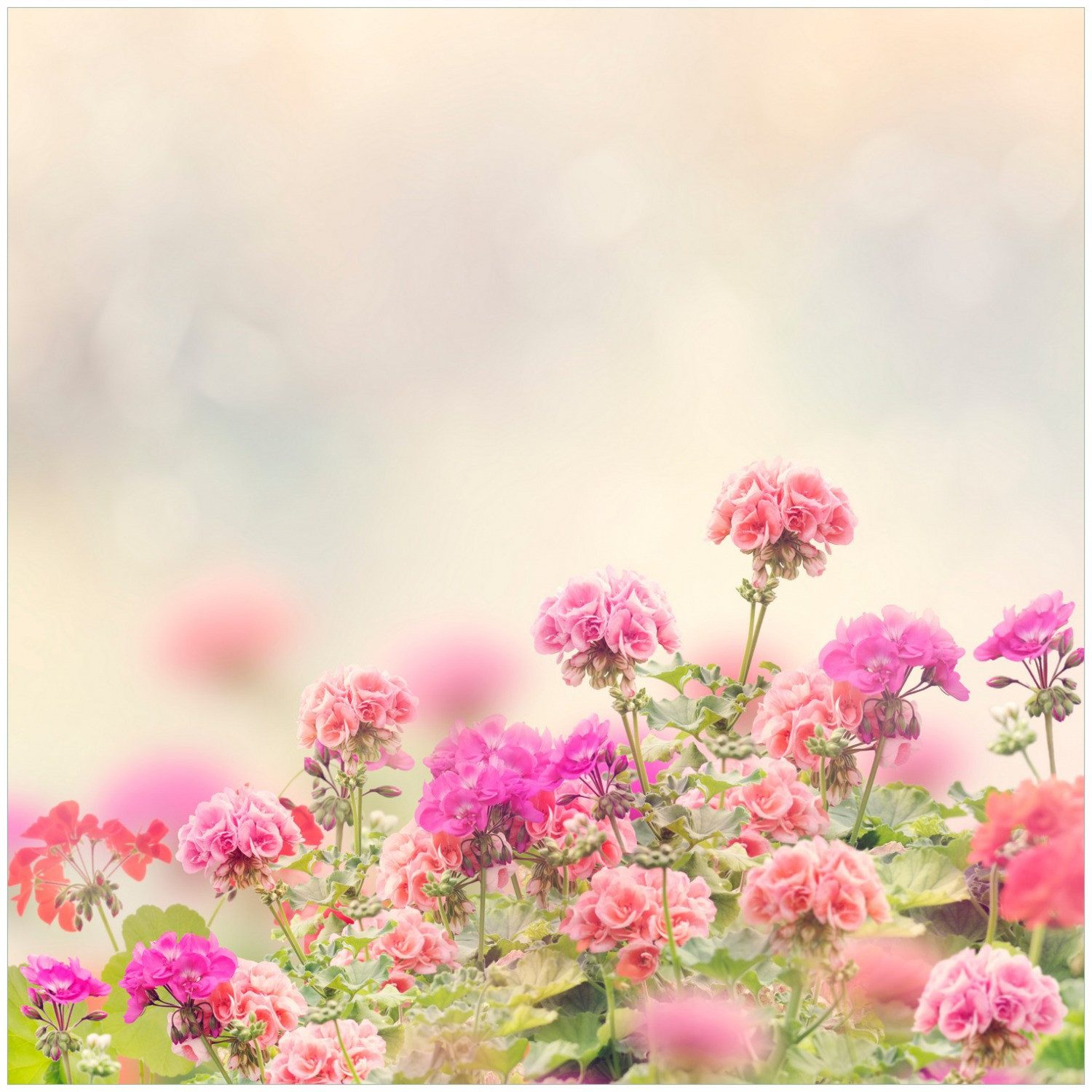 Ein farbenfrohes Blütenmeer in Rosa- und Pinktönen erstreckt sich vor einem weich verschwommenen Hintergrund in zarten Pastellfarben. Die sanfte Lichtstimmung lässt die Geranien fast träumerisch wirken ? ein perfektes Bild für Frühlingsgefühle, Gartenfreude oder romantische Dekorationen.